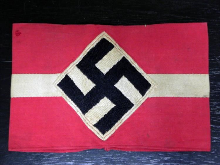THIS IS A NICE ORIGINAL HITLER YOUTH ARMBAND. IT IS SEWN IN BACK & OBVIOUSLY WORN--BEVO WEAVE DIAMOND & SWASTIKA.