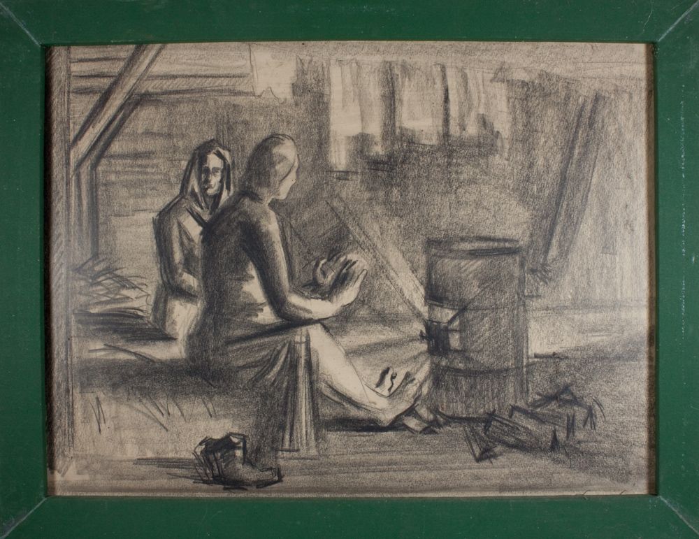 Original charcoal depiction of the interior of concentration camp barracks, 22 1/2" x 17" (sight), showing two women in a concentration camp barracks seated on straw bedding as they warm themselves before a crude stove made from an oil drum. Their laundry hangs on a line in the background. Unsigned. The image was done on thin cardboard with a matte white coating on the reverse which also bears an untranslated inscription in green ink, likely Hungarian. Set in a crude green frame "decoratively" covered in green cloth tape quite some time ago. Almost certainly a period piece, most likely done by a female ex-prisoner while at a DP camp.