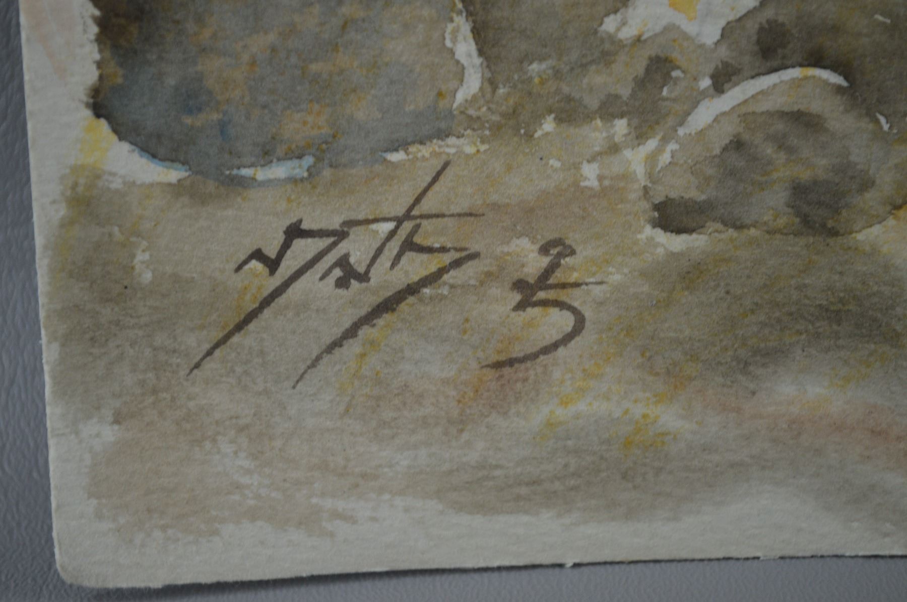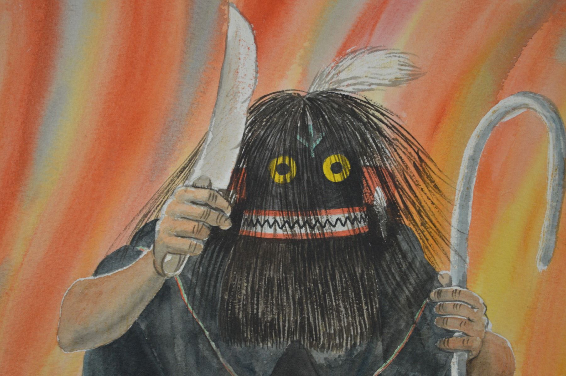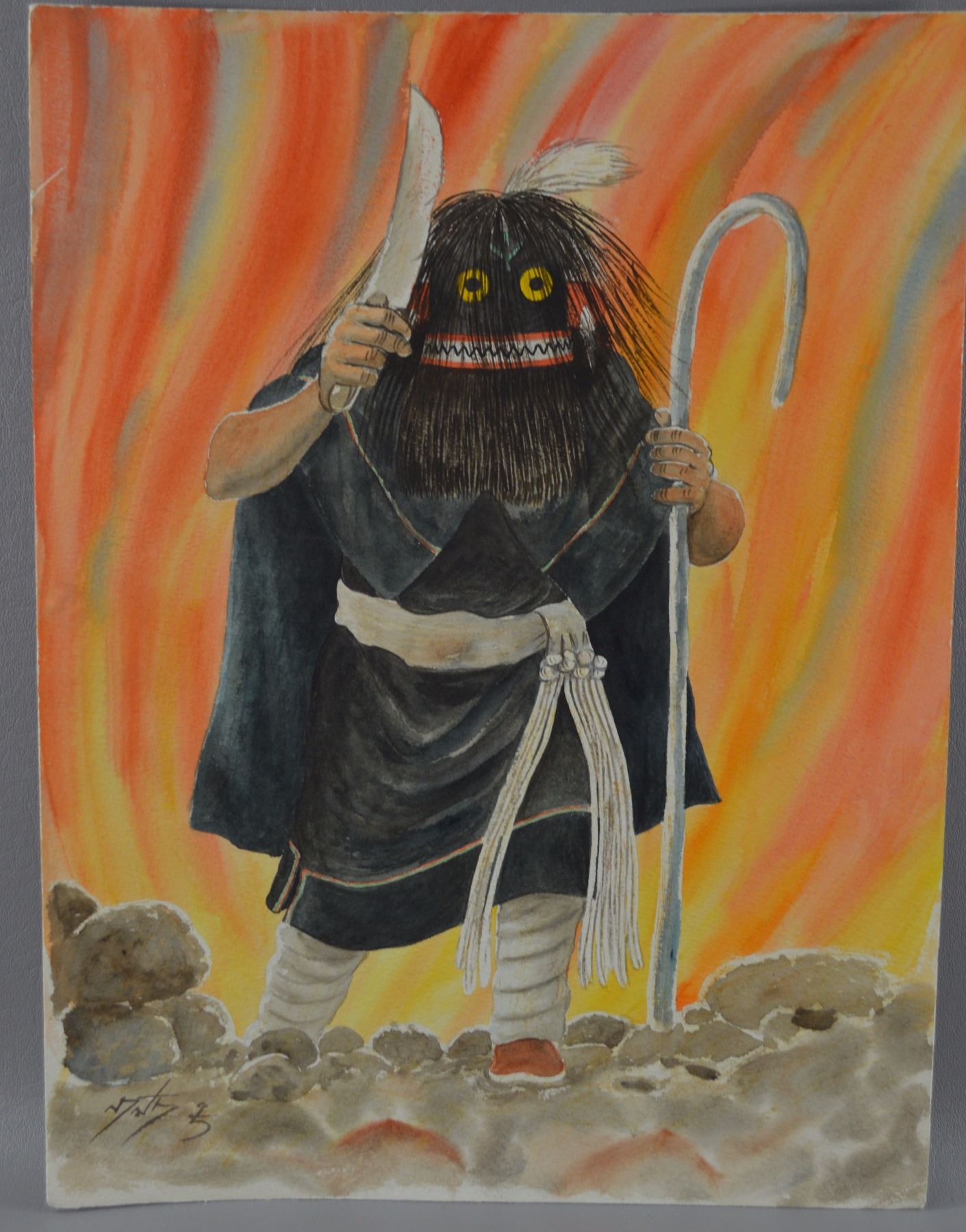 2015. Hand painted on paper depicting long hair ogre kachina. Signed Neil David