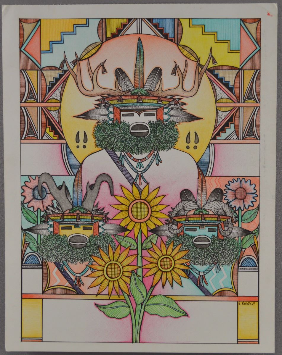 1990's. Hand painted on paper with kachina, antelope and big horn sheep kachina and fine line geometric background. Signed Ron Koopee. 11" x 14"