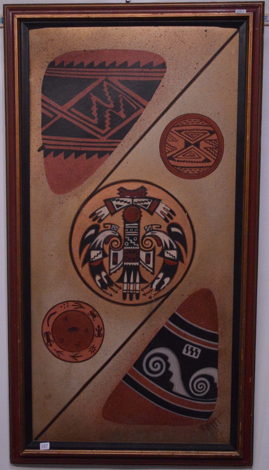 1970's. Hand painted watercolor on board depicting Anasazi, Sityaki, and Mimbres pottery. Has water damage. Signed R. Naha for Raymond Naha.