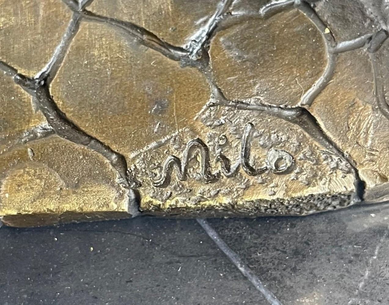 Works of art depicting the beautiful and elegant horse remain an extremely popular choice for visitors to Europeanbronze.com. Although the horses contact with man stems back 30,000 B.C., it was initially seen as a source of food. As time went on, however, man learned that the horse could be an extremely useful asset in everyday life. Whether the horse was used for transportation or simply to aid in hunting animals that man could not traditionally catch, this once hunted creature became vary valuable. The domestication of the horse was first seen around 3000 B.C. in China where horse drawn chariots were used in wars and invasions. The horse was highly popularized in the art of the Romans with numerous popular pieces depicting the anatomical features of the horse to more dynamic sculptures of battles and chariot races. The horse gained further recognition by the cowboys and American Indians of the wild west who relied so heavily on this creature for survival. In a more contemporary setting, the elegance of the sport of thoroughbred racing has put the horse on a pedestal above most other animals. European Bronze is proud to offer a large selection of horse statues, bronze horse sculptures, and horse head busts in many different sizes and styles. Please browse our horse statue gallery. A bronzed metal figure of two horses on ledge signed by artist Milo.
