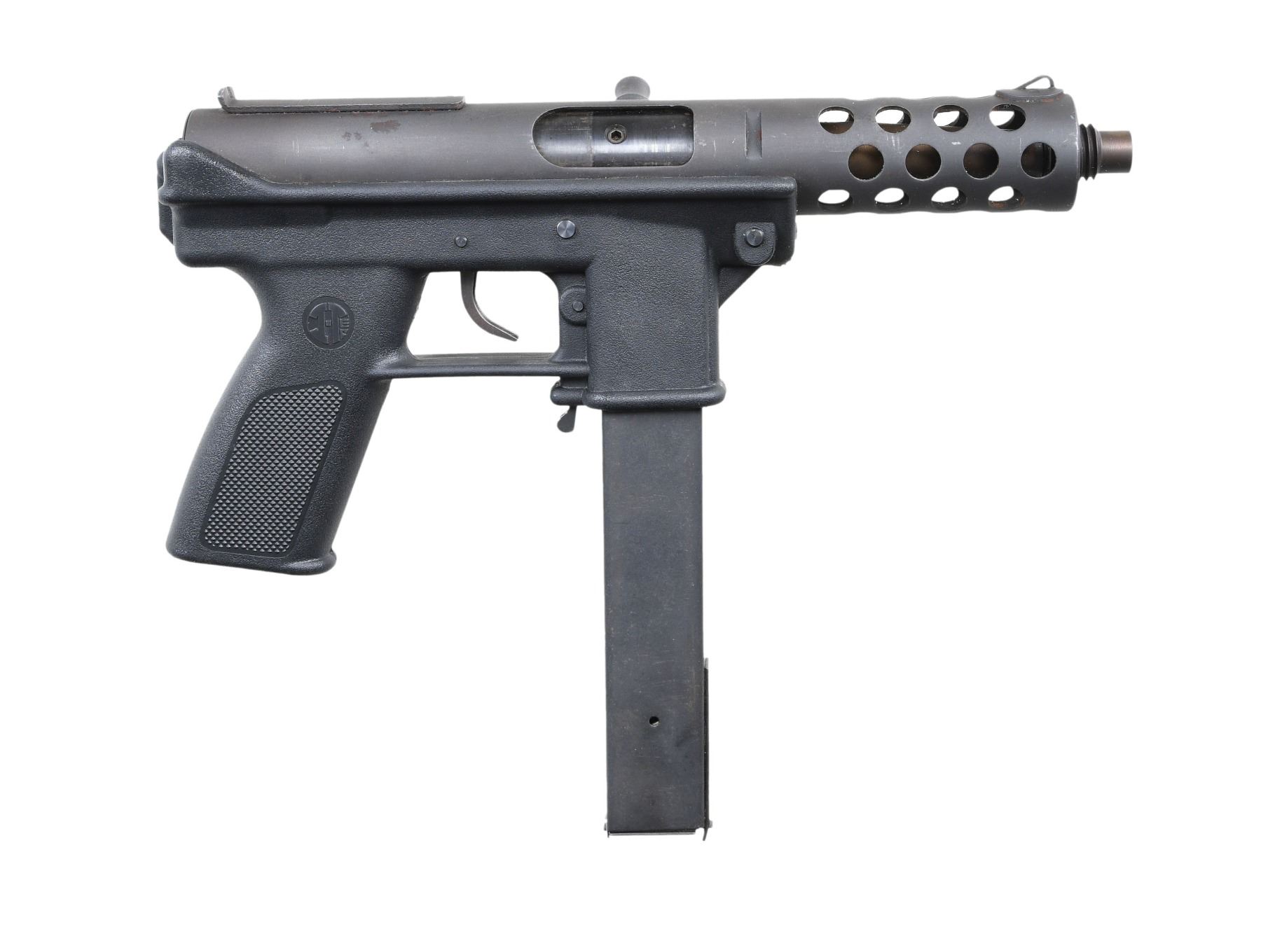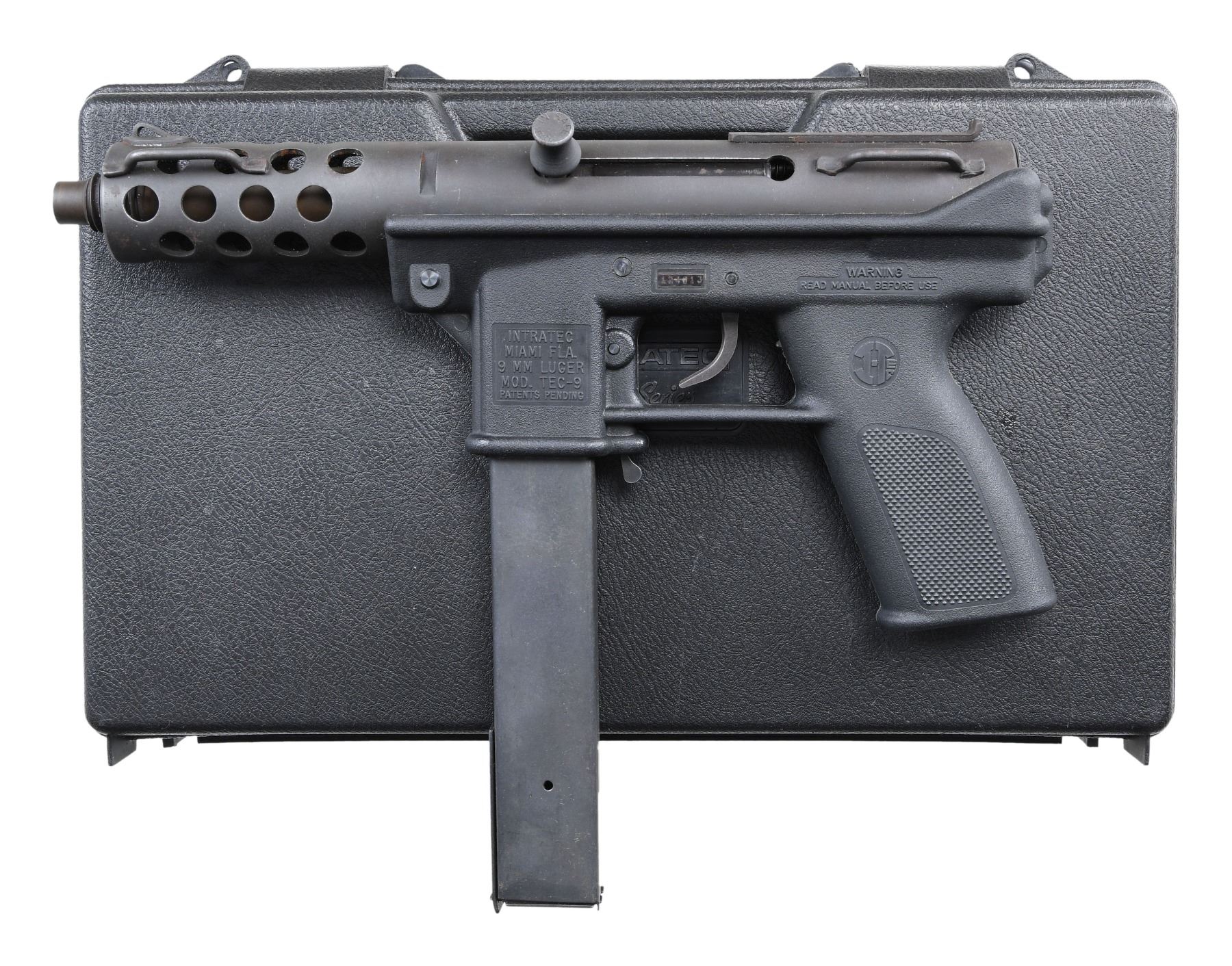 Cal. 9mm. S# 124613. Bbl. 5". Interdynamic of Sweden originally mfg. the KG-9 in its semi auto configuration as a simple blowback operated, open bolt design. Following the 1982 BATF ruling outlawing open bolt semi auto firearms, they were redesigned as a striker fired, closed bolt system & designated the KG-99. The U.S. based branch located in Miami, FL eventually changed company name to Intratec where they marketed it as the Tec-9, later changing to the DC-9. Following the Federal knee jerk reactionary assault weapons ban, changes were made to comply such as mfg. the bbl. w/out threads at the bore where it was rebranded once again as the AB-10 ("AB" is After Ban). This example is the original TEC-9. With a polymer frame & tubular upper receiver extended to the front, as a ventilated bbl. shroud. It was generally regarded as heavy & awkward in its configuration as a semi automatic pistol though it gained popularity largely due to the media induced disinformation & hyperbole combined w/ it being a favorite "boogeyman" of the anti gun groups simply due to its aesthetics. Fixed sights permanently attached to receiver. The safety is built into the charging handle & engaged by pressing it in w/ the bolt in the closed position. Matte black finish on exposed metal surfaces. Polymer receiver is injection molded black in color. Mag. release is located below the trigger to the rear of the mag. well. Bbl. shroud conceals bbl. threads which may be utilized to accommodate several muzzle accessories. MAGS: 1 metal 36 rd. UNATTACHED ACCESSORIES: Factory black plastic transport box w/ owners manual. CONDITION: finish on exposed metal surfaces is complete & consistent though it has earned some light patina, obvious under close inspection. Plastic receiver section bears very little evidence of actual use. Bore is shiny w/ strong rifling. Fire control mechanism appears to function correctly when cycled by hand. (25-1591/JZ). MODERN. $500-800.