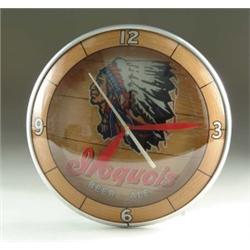 ORIGINAL IROQUOIS BEER AND ALE BACK-LIT CLOCK. A double-bubble clock design which features an Indian in full headdress on the inner dial. Manufactured by Advertising Products, Cincinnati, OH, circa 1950’s. SIZE: 15” diam. CONDITION: Missing one rear bulb cover; otherwise very good working condition. 1-3623 (800-900)