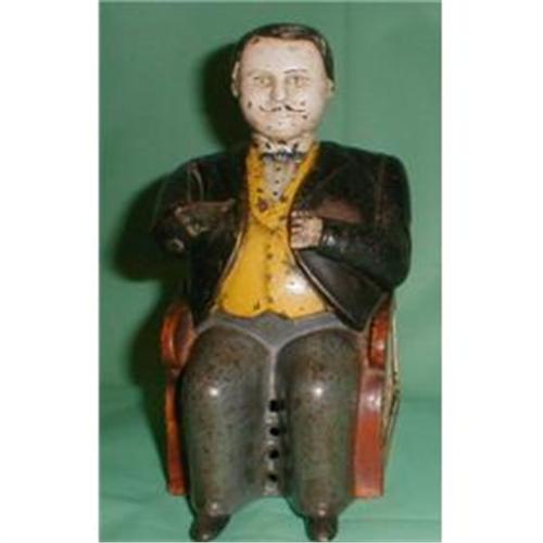 This is an original TAMMANY or LITTLE FAT MAN mechanical bank that was manufactured by the J.E. STEVENS CO. of Cromwell, Conn. and patented December 23, 1873. Put the coin in the mans right hand and he drops the coin into his jacket pocket....unfortunately for this poor fellow, he is missing his right hand. The paint however is in very good condition and what appeals to me most about him is the condition of the paint on his face which is very good.