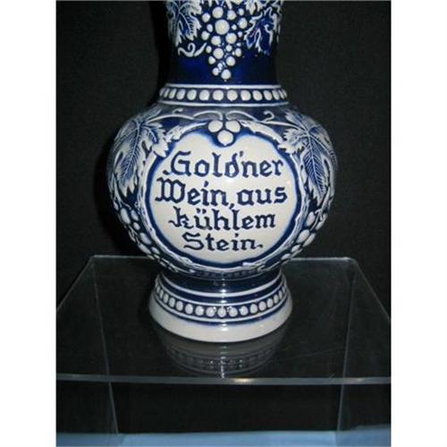 GOOD LOOKING WINE STEIN, WITH THE GRAPE LEAF PATTERN AROUND THE PIECE. IN THE CARTOUCHE IT SAYS NACH VATER ART TRINKT WIEN AUS STEIN, THE BLUE COBALT COLOR IS DEEP AND RICH, AND THE CONDITION IS WONDERFUL