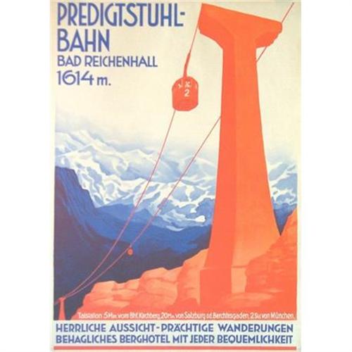 ORIGINAL GERMAN TRAVEL POSTER SHOWING HUMBOLT TRANSPORTING PEOPLE UP TO PREDIGSTUHL-BAHN,IN HANGER FORM. IT WAS MEANT TO HANG IN A TRAVEL AGENCY WINDOW OR SIMILAR AREA. THERE ARE METAL BANDS ON THE TOP AND BOTTOM. A STRING IS IN PLACE ON TOP FOR HANGING. UNUSED. GREAT COLOR GREAT CONDITION.