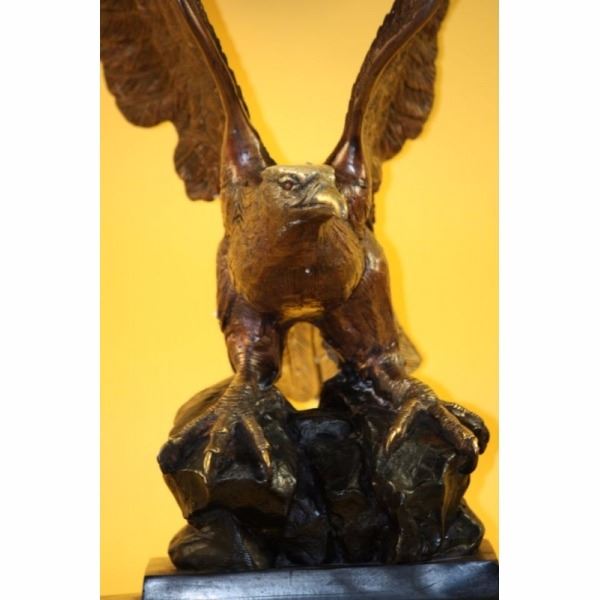 He grips tightly to the rock with his talons and he spreads his wings high and wide as if he is about to take off. His head is cocked off to the left as if he has just spotted his new prey. This American Bald Eagle is an absolutely gorgeous species with a strikingly beautiful look. His fully spread wing span is an amazing breathtaking sight giving this sculpture an energetic vibe. The detail of his face, beak and talons are quite intricate and has great life like qualities. This gorgeous bird's beauty demands respect and he personifies in himself freedom. This sculpture was cast usign the "Lost Wax Method" ensuring the detail of quality. This sculpture has a special hand painted patina and is a Limited Edition. This sculpture is mounted on a gorgeous black marble base and is Signe M. Nardini.Condition: This sculpture is in a very Good condition. Bronze Dimensions with Marble Base:Height 30" x Width 15.5"Marble Dimensions: 16" X 9"Height without base:28" Weight :50 LBSInventory : 24-56308M24042 He grips tightly to the rock with his talons and he spreads his wings high and wide as if he is about to take off. His head is cocked off to the left as if he has just spotted his new prey. This American Bald Eagle is an absolutely gorgeous species with a strikingly beautiful look. His fully spread wing span is an amazing breatht