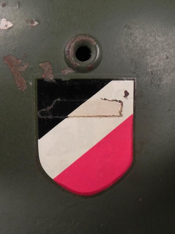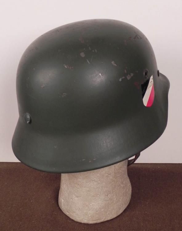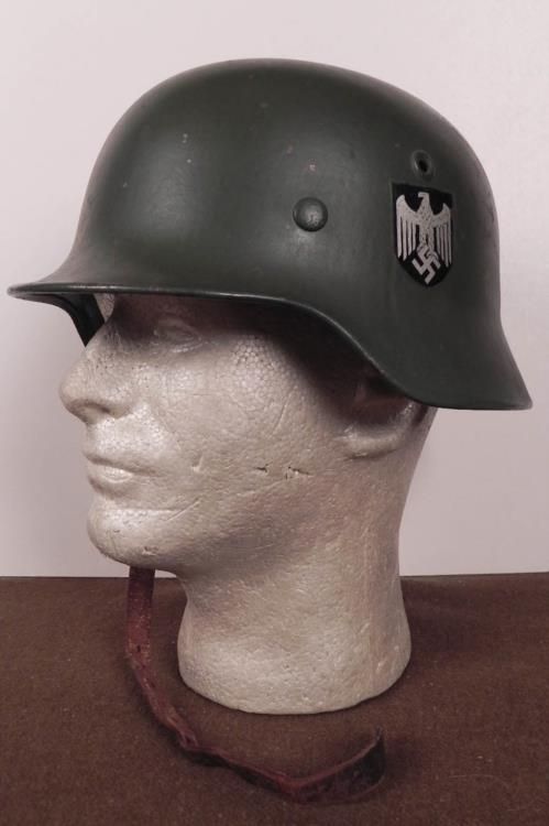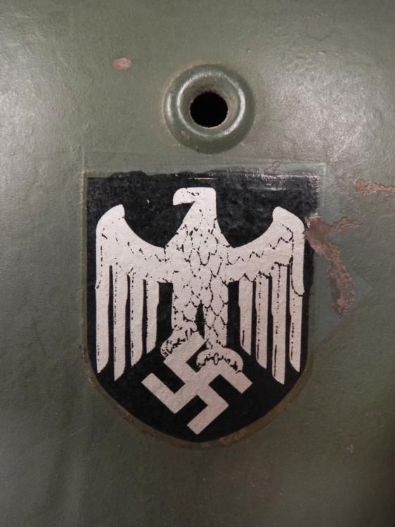 ORIGINAL M40 NAZI HELMET-ORIGINAL LINER & CHINSTRAP-ET66-RE-PAINTED W/DOUBLE WEHRMACHT DECALS * THIS IS AN ORIGINAL NAZI GERMAN M40 HELMET WITH ORIGINAL LINER AND CHINSTRAP--INSIDE MARKET W/MAKER & SIZE "ET66"--"1263" CONTROL # STAMPED INSIDE BACK BRIM--HAS BEEN RE-PAINTED INSIDE & OUT AND DOUBLE WEHRMACHT PLACED ON OUTER SIDES--FLAT PAINT & NICE DECALS-INSIDE IS A GLOSSY PAINT--LINER STAMPED "59"--NICE DISPLAY HELMET OR RESTORATION PROJECT.