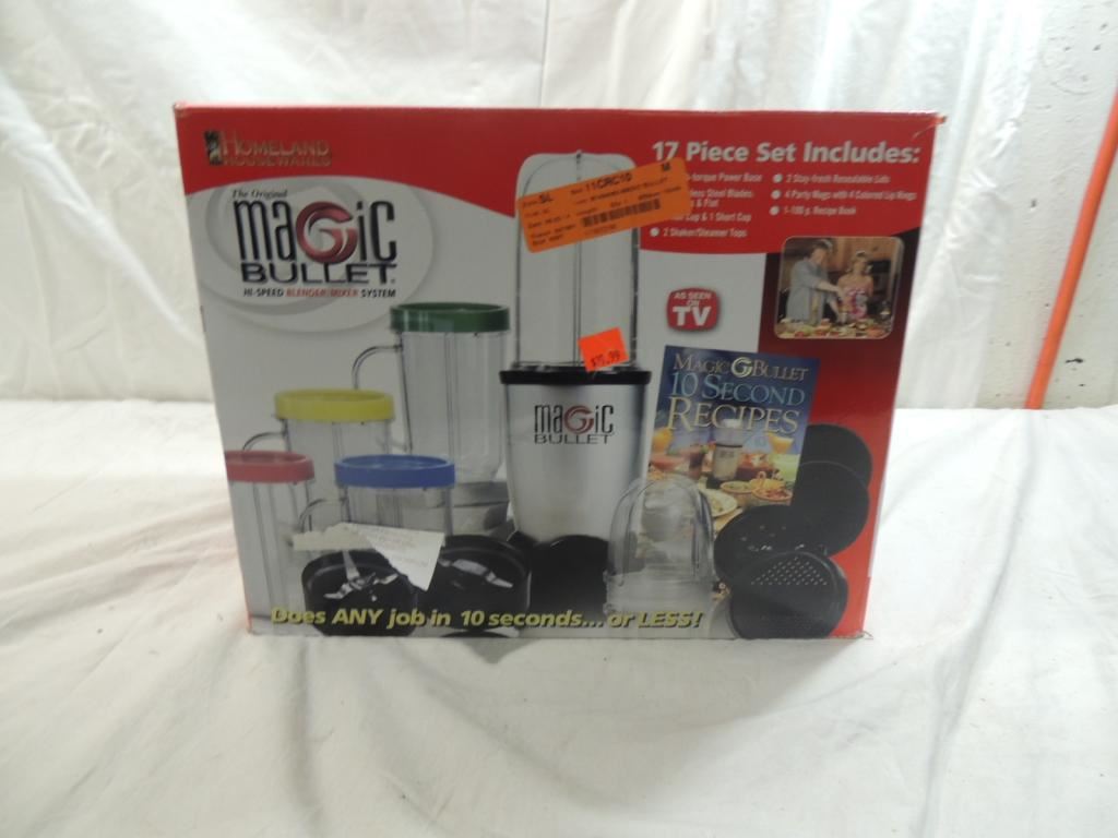 17PC SET HIGH TORQUE POWER BASE, STAINLESS STEEL BLADES, TALL CUP, SHORT CUP, SHAKER, STEAMER, RESEALABLE LIDS, LIP RINGS, RECIPE BOOK, AS SEEN ON TV, AS IS, IN BOX AS SHOWN SEE PHOTO FOR MORE DETAILS.