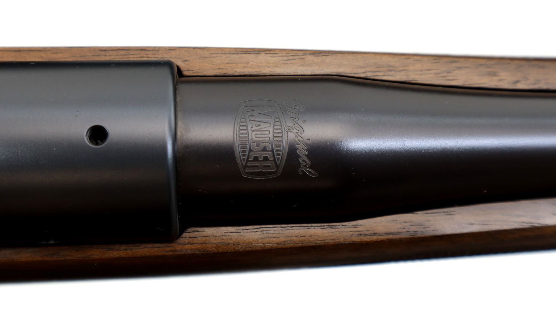Main Description: Blade front sight with ramp, adjustable u notched rear sight with ramp, matte blued metal finish, receiver drilled and tapped with no plug screws installed, smooth bolt knob. One piece Satin finish wood stock, checkered forearm and pistol grip, European cheek rest, black rubber recoil pad, grip cap, Mauser logo on bottom of mag, swivel studs.