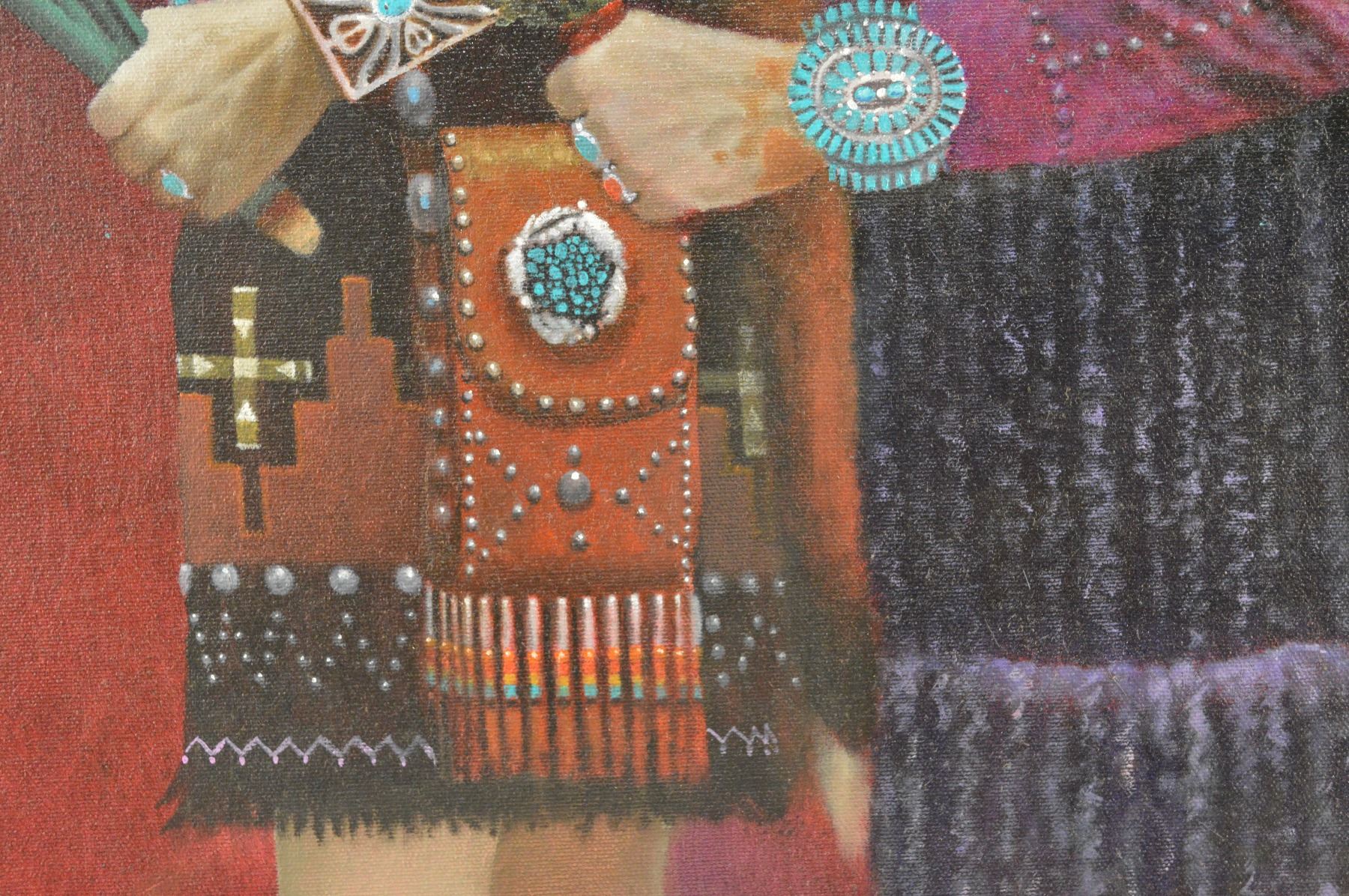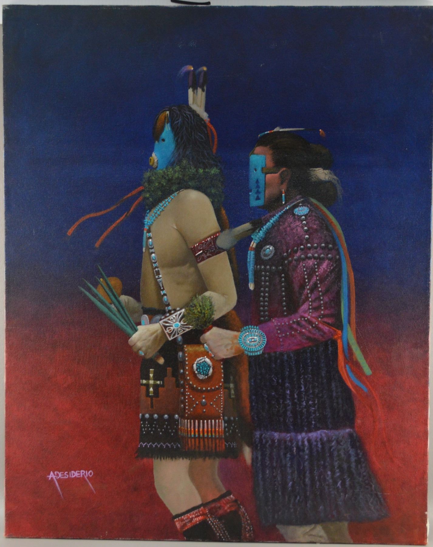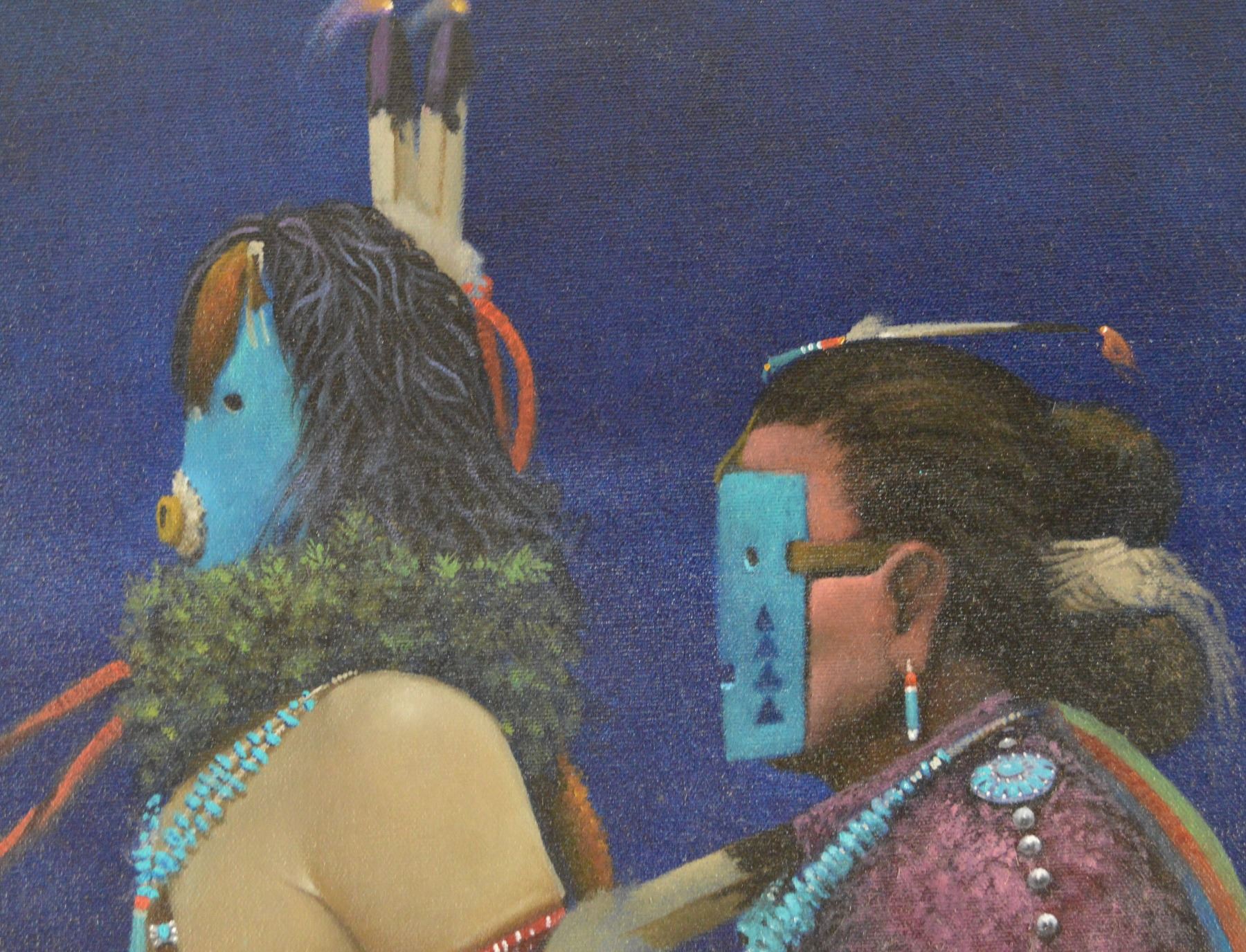 1990's. Hand painted on canvas depicting Male and Female Yei-bi-chei dancers. Signed Adesiderio