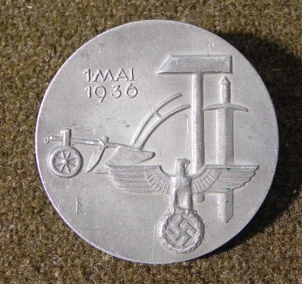 HERE IS AN ORIGINAL NAZI 1936 MAY DAY WORKERS BADGE. IT SHOWS AN"EAGLE/SWASTIKA,PLOW-HAMMER &SWORD. THE BADGE HAS THE MAKER'S MARK""ON THE REVERSE ,""HERMANN BAUER-SCHWAB-GMUND"". IT IS A PIN BACK AND IT""IS 1 3/8"" DIAMETER."