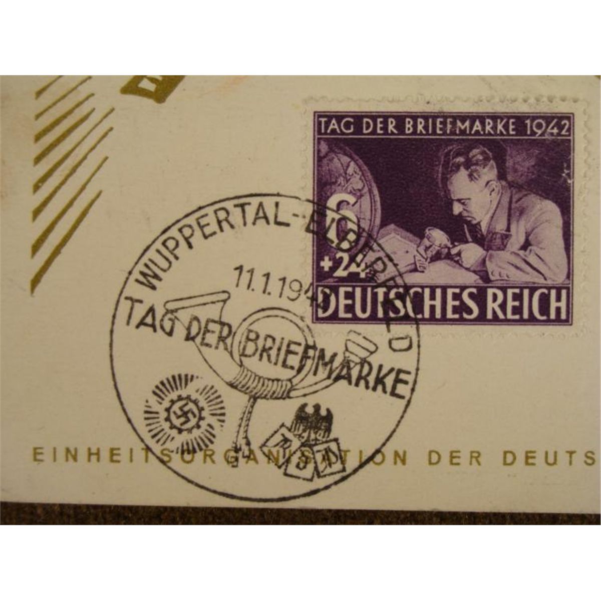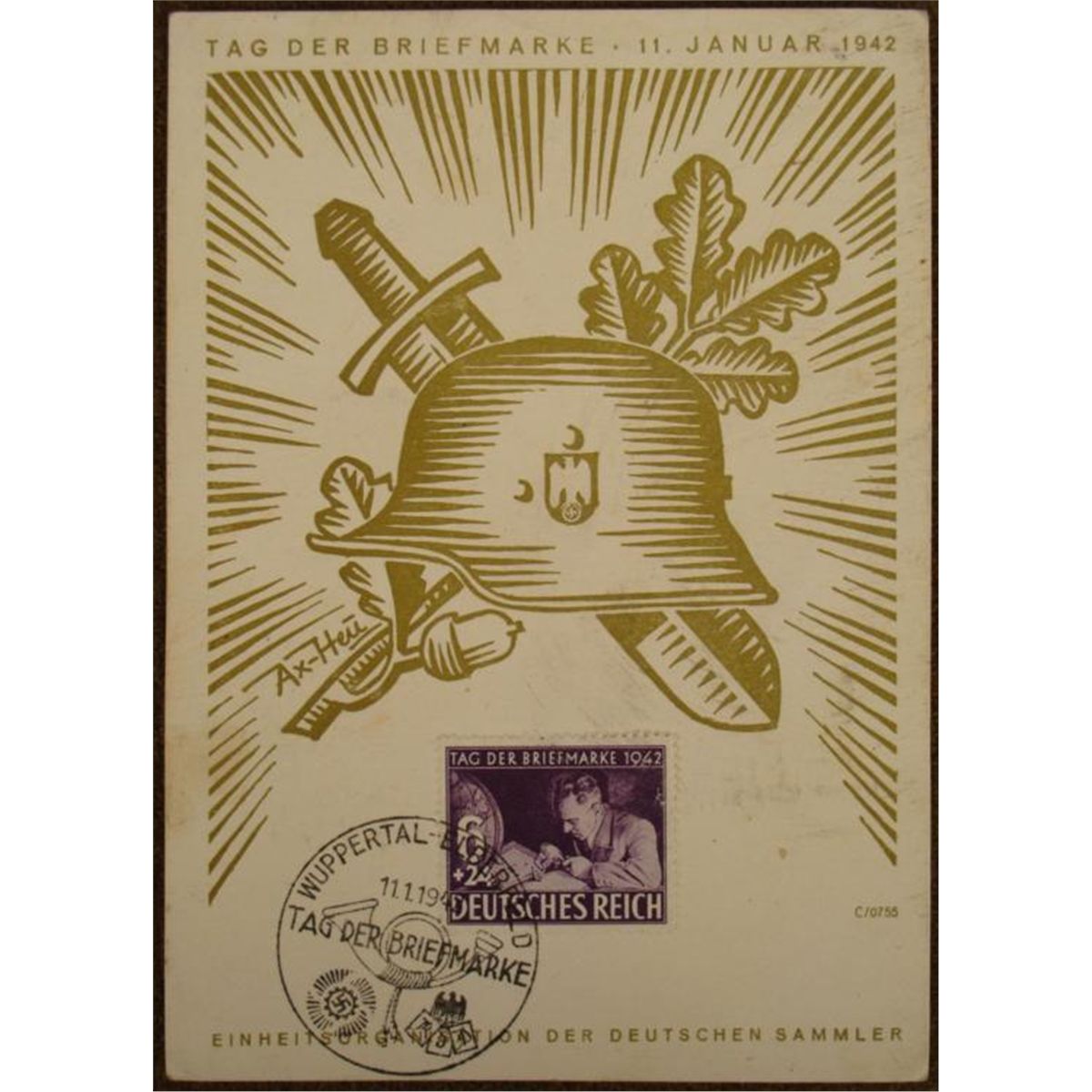 ORIGINAL NAZI 1942 POSTCARD-STAMPED & POSTMARKED-HELMET & SWORD W/OAK LEAVES * SINGLE SIDED-TAG DER BRIEFMARKE--11 JANUARY 1942 *