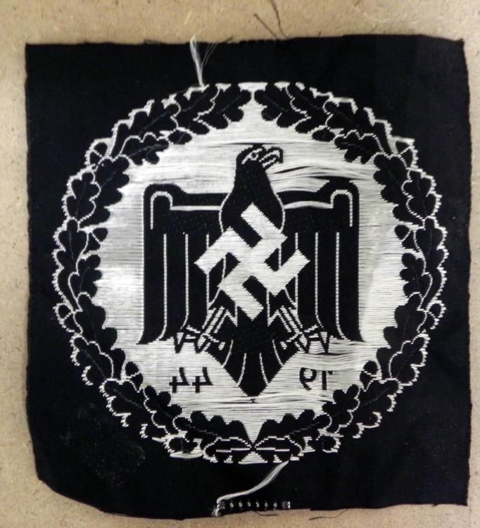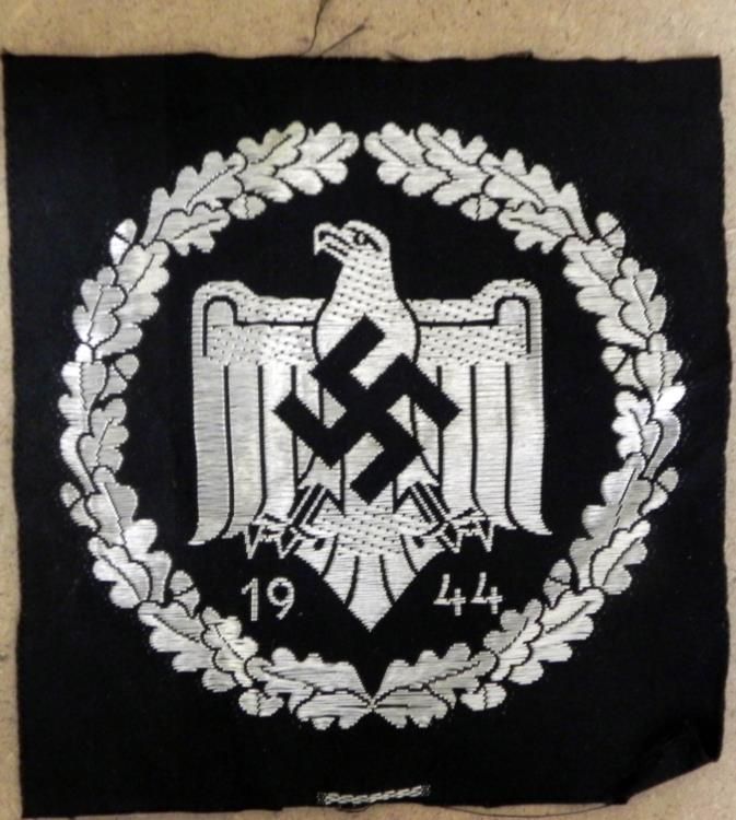 THIS AN ORIGINAL NAZI 1944 SPORTS EAGLE & SWASTIKA UNIFORM PATCH. IT MEASURES OUT TO BE 3 1/2 X 3 1/2"--SILVER ON BLACK BACKGROUND.