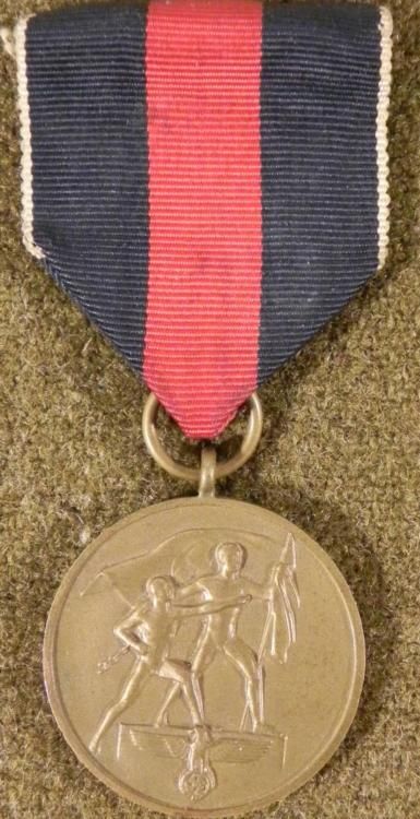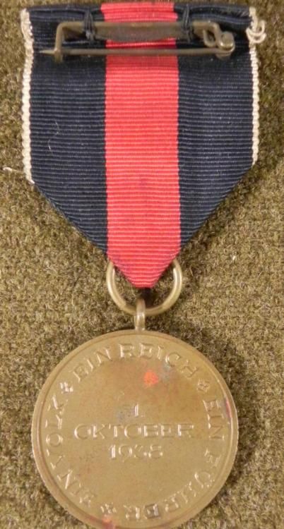 HERE IS AN ORIGINAL NAZI CZECHOSLOVAKIA OCCUPATION BADGE. THIS NICE ORIGINAL VET BRING BACK SHOWS MEN ABOVE EAGLE & SWASTIKA. IT IS DATED ON THE BACK-OCTOBER 1938. THIS WAS AWARDED TO THOSE NAZI SOLDIERS PARTICIPATING IN THE BLOODLESS TAKE OVER OF THAT COUNTRY. THE BADGE COMES WITH A RIBBON AND PIN. * *