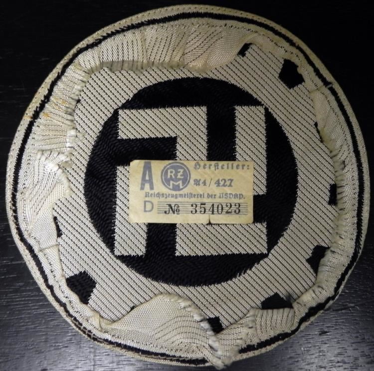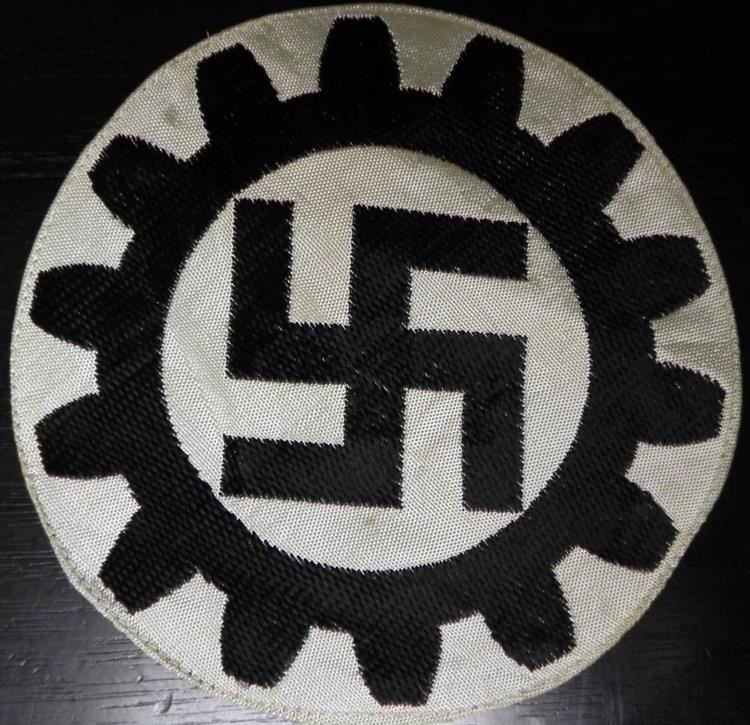 NICE ORIGINAL NAZI DAF ATHLETIC SPORT SHIRT PATCH-MADE WITH SATIN TYPE MATERIAL WITH BEVO WEAVE COG WHEEL & SWASTIKA--IT IS 5" IN DIAMETER AND HAS THE RZM TAG ON REVERSE.