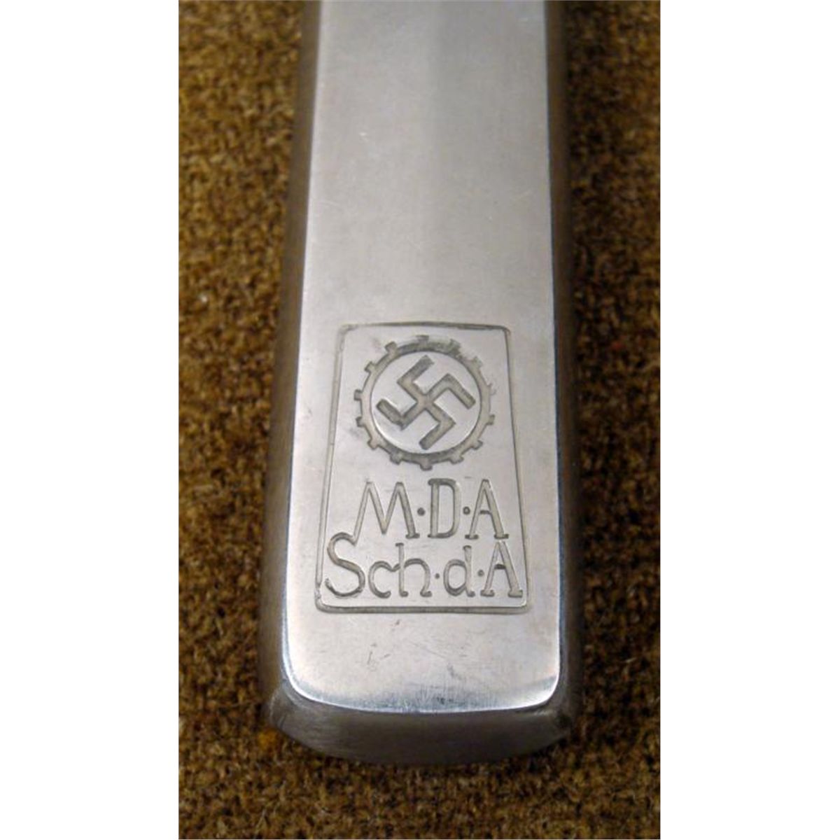 THIS IS AN ORIGINAL, RARE NAZI DAF DEUTSCHE ARBEITS FRONT SCHOOL, QUALITY TABLE KNIFE. ALL OF THE CROSS-GRAINING IS VISIBLE ON THE BLADE. THE HANDLE IS STAMPED WITH A DAF COG WHEEL AND "M-D-A SCH-D-A" IN A RECTANGLE. * * * *