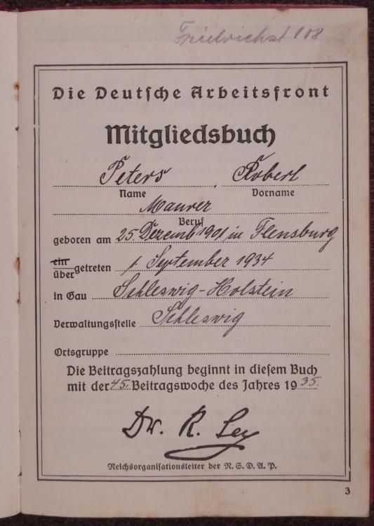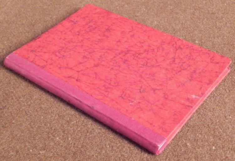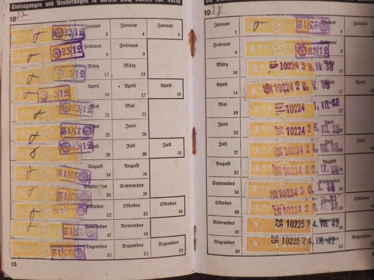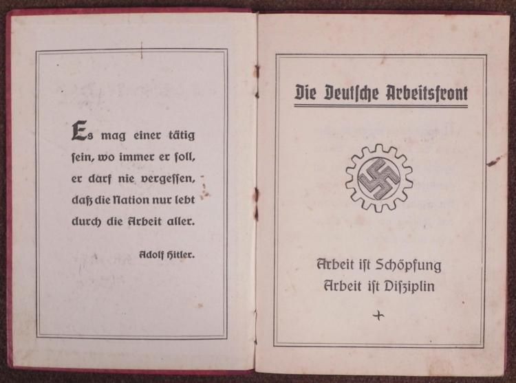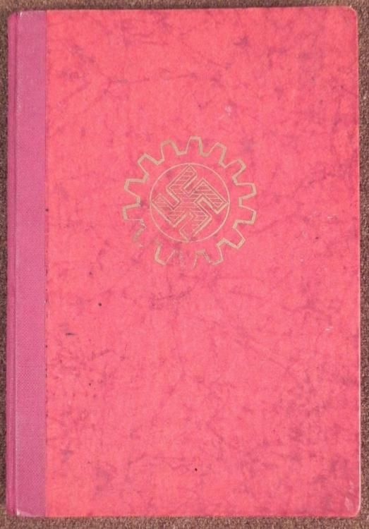 ORIGINAL NAZI DAF "DEUTSCHES ARBEIT FRONT" -ID AND DUES HARD COVER BOOK * MANY STAMPINGS, DUES STAMPS--ALL WITH SWASTIKAS IN GEAR--RED COLORED IDENTIFICATION BOOK WITH GOLD GEAR AND SWASTIKA ON COVER *