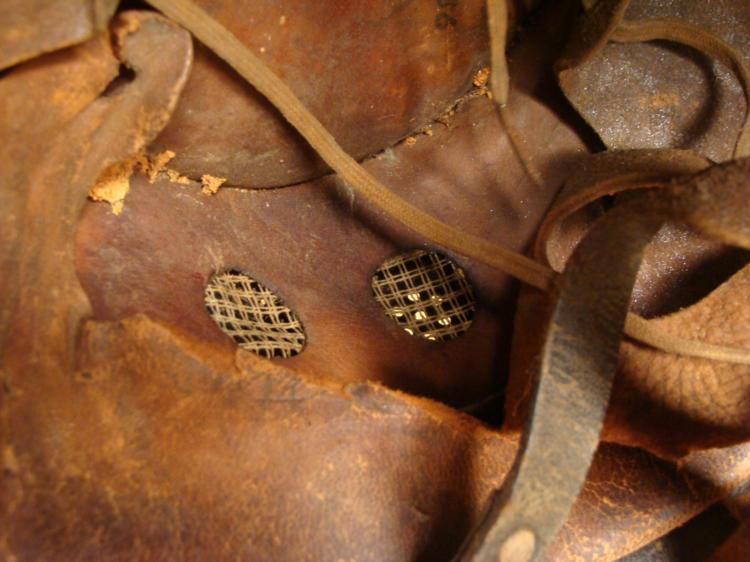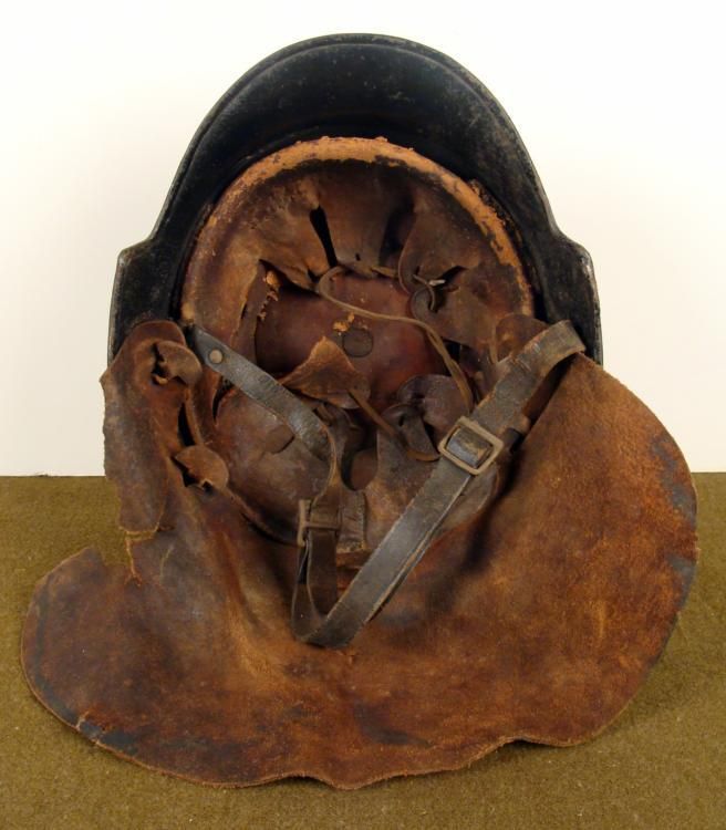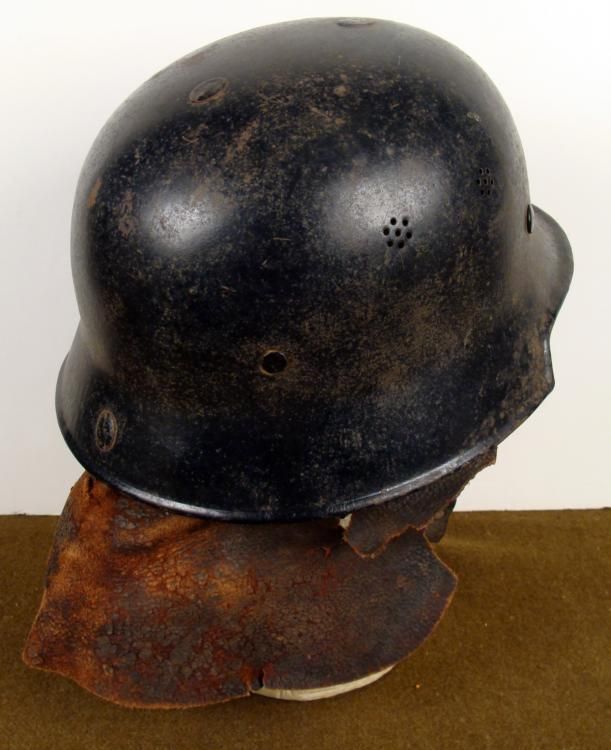HERE IS AN ORIGINAL NAZI FIRE POLICE HELMET. ON THE INSIDE IT IS STAMPED "THALE A". THE INSIDE CROWN PAD HAS BEEN INK STAMPED "DRGM-1041806". IT HAS A FULL CHINSTRAP, LINER AND A LEATHER FIREMAN'S NECK PROTECTOR. THE HELMET HAS BLACK PAINT, WITH SALT AND PEPPER AIR VENTS ON BOTH UPPER SIDES OF THE HELMET. THE NECK PROTECTS HAS BEEN TORN AND IS IN GOOD OVERALL CONDITION. * * * *