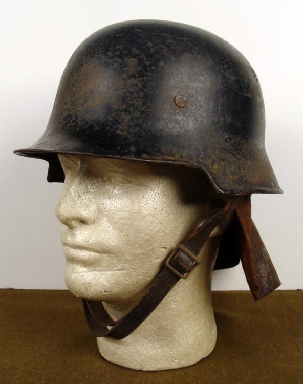 HERE IS AN ORIGINAL NAZI FIRE POLICE HELMET.  ON THE INSIDE IT IS STAMPED "THALE A".  THE INSIDE CROWN PAD HAS BEEN INK STAMPED "DRGM-1041806".  IT HAS A FULL CHINSTRAP, LINER AND A LEATHER FIREMAN'S NECK PROTECTOR.  THE HELMET HAS BLACK PAINT, WITH SALT AND PEPPER AIR VENTS ON BOTH UPPER SIDES OF THE HELMET.  THE NECK PROTECTS HAS BEEN TORN AND IS IN GOOD OVERALL CONDITION.    *  *  *  *