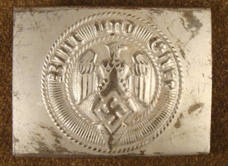 HERE IS AN ORIGINAL NAZI HITLER YOUTH ORIGINAL BUCKLE, "BLUT UND EHRE" WITH EAGLE & SWASTIKA IN DIAMOND. IT IS OF A PAINTED METAL VARIETY. *