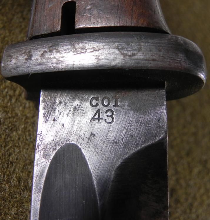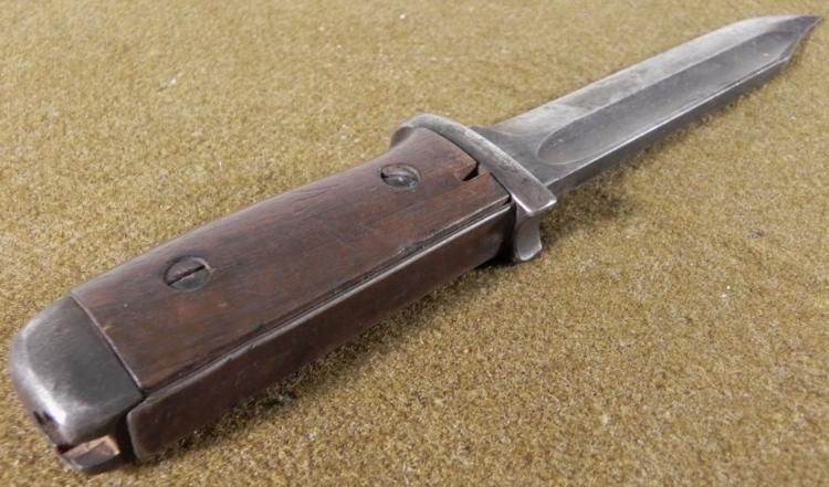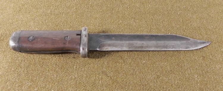 HERE IS AN ORIGINAL NAZI K98 BAYONET CUT DOWN TO CLOSE COMBAT BOOT"KNIFE THAT IS 10"" LONG. THIS IS AN INTERESTING FIELD MODIFIED CLOSE"COMBAT BOOT KNIFE MADE FROM 98K BAYONET. IT HAS WOOD GRIPS AND A"MODIFIED TOP AND CLIP POINT BLADE. THE RICASSO IS MARKED ""COI 43"" AND""""5605 H""."