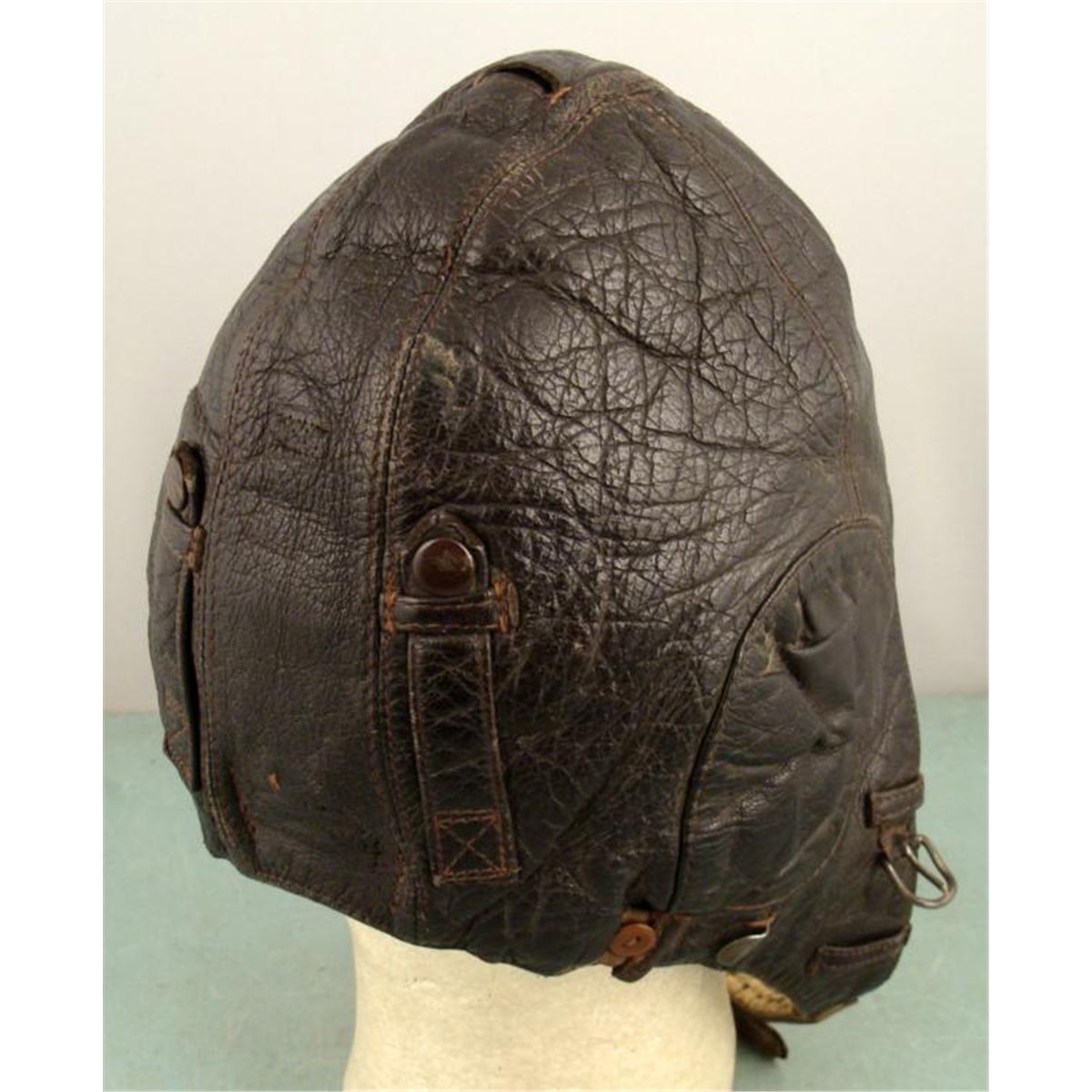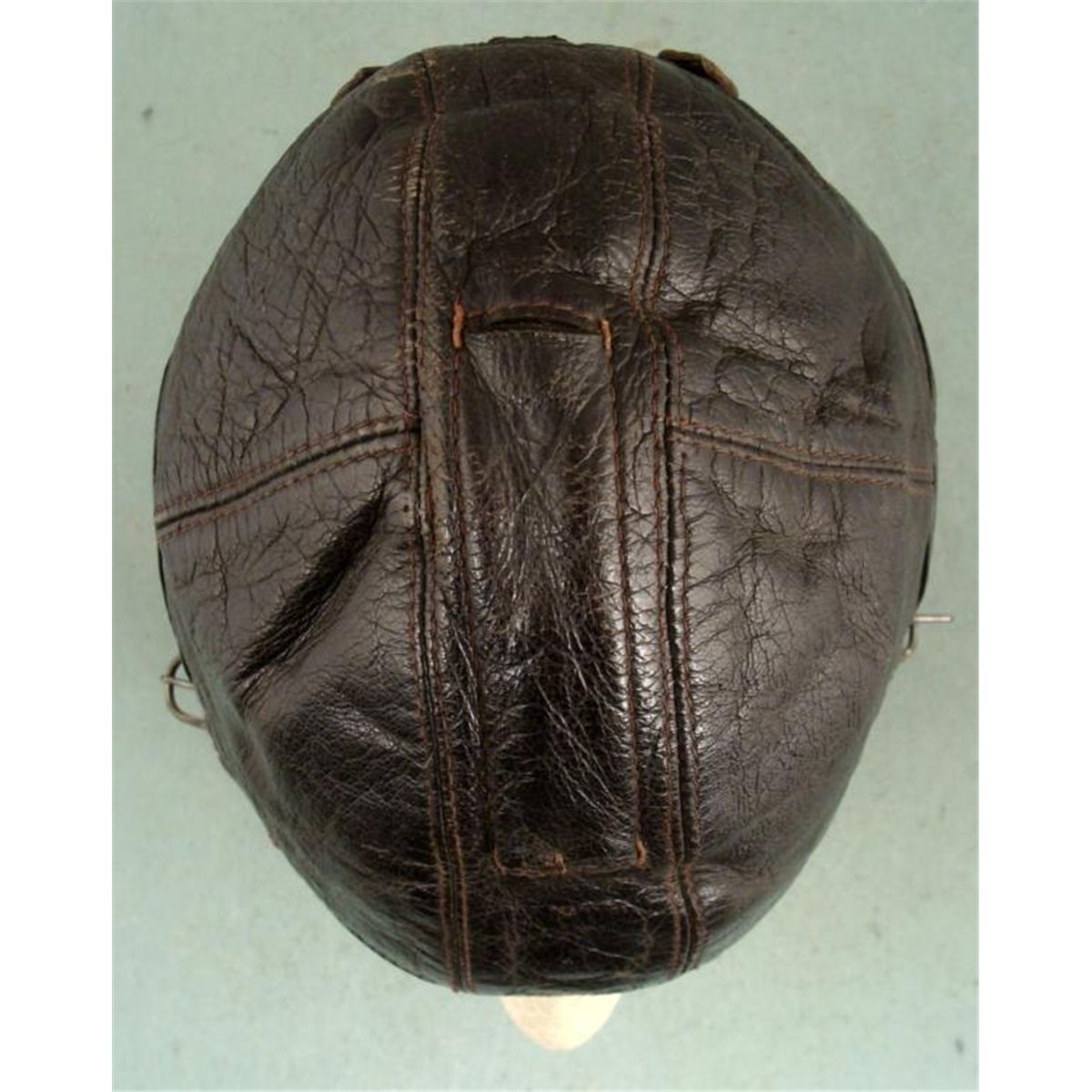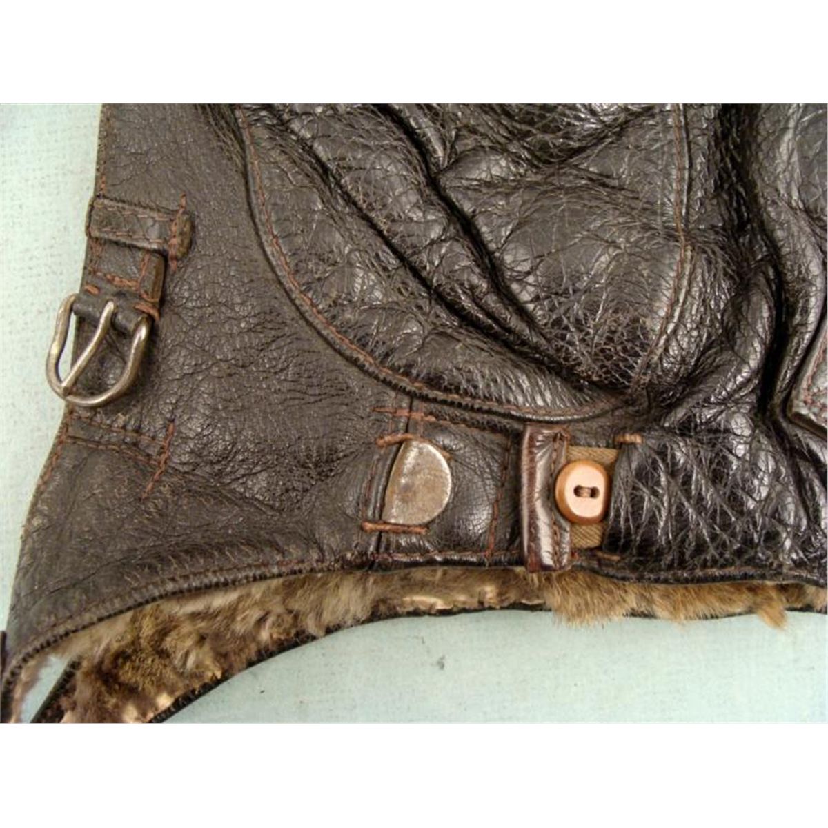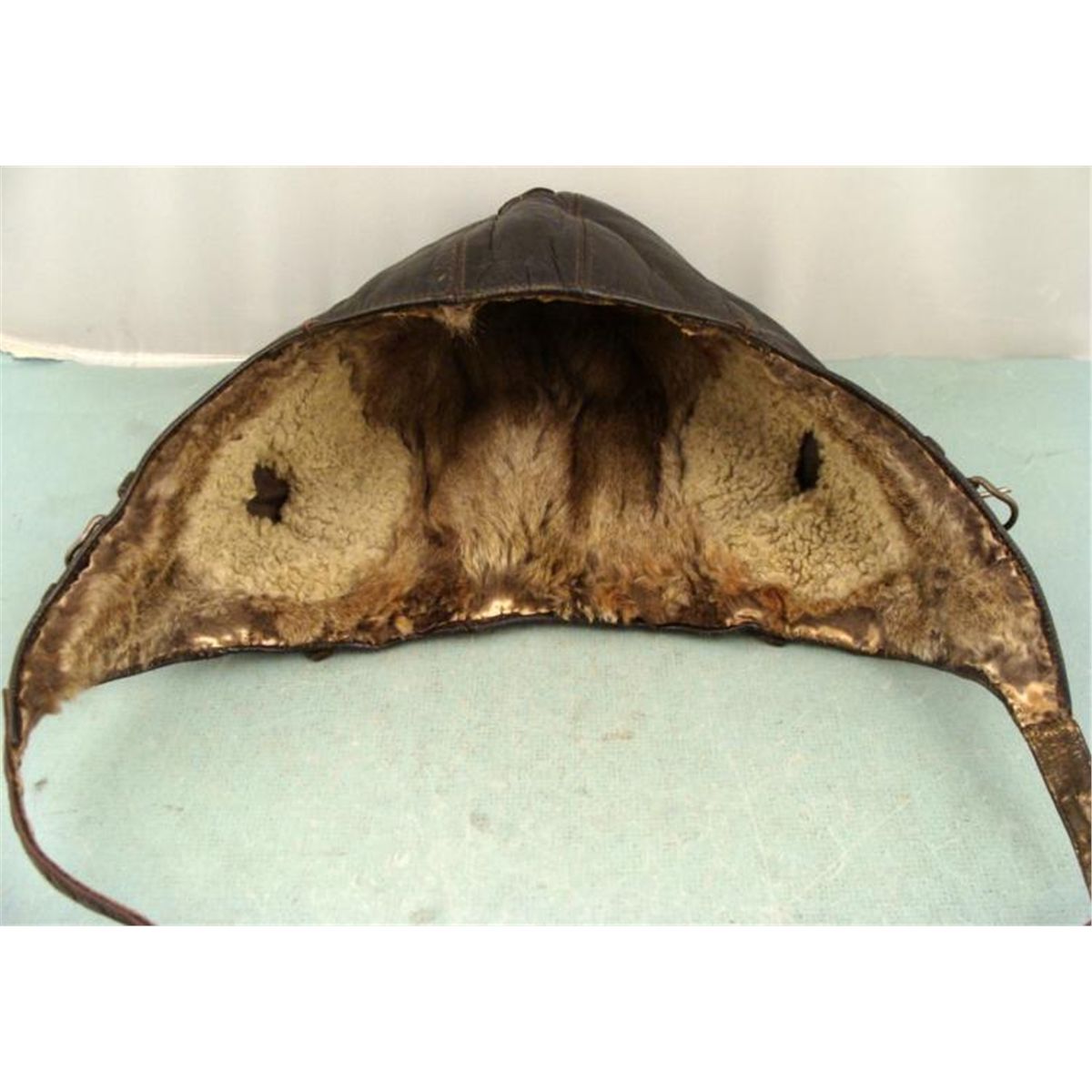 HERE IS A COLD WEATHER NAZI LUFTWAFFE CHOCOLATE BROWN LEATHER FLIGHT HELMET. IT HAS FUR LINING AND LAMBS WOOL AROUND THE EARS INSIDE. THE HELMET HAS NICE PLIABLE SOFT LEATHER WITH TWO STRAPS & BUCKLES. *