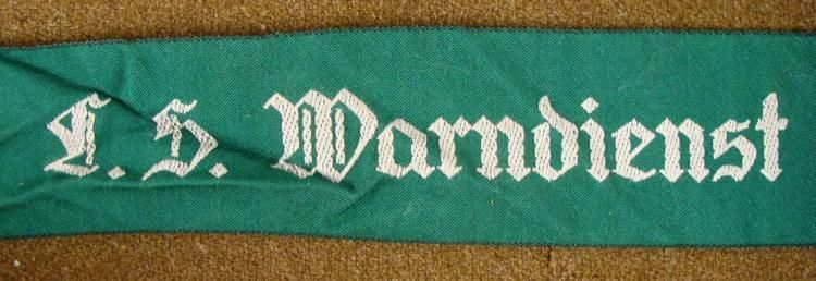 THIS IS AN EARLY ORIGINAL NAZI LUFTSCHUTZ WARDEN CUFF TITLE; "L S WARNDIENST". IT IS 2" X 17", GREEN WITH A SILVER BEVO STITCH, AND HAS THE MAKER'S MARK. * *