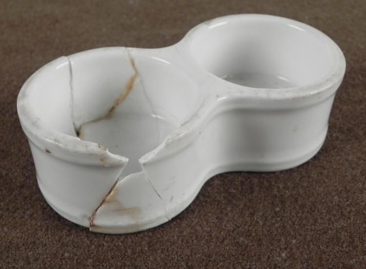 OFFERED HERE IS AN ORIGINAL NAZI LUFTWAFFE DINING HALL PORCELAIN SALT & PEPPER HOLDER. THERE IS DAMAGE TO ONE COMPARTMENT WITH A PERIOD CRUDE REPAIRS TO CRACKS AND A CHIP MISSING. THE BACK HAS THE MAKER'S MARK WITH LOGO AND IS DATED 1942. THERE IS A LUFTWAFFE EAGLE & SWASTIKA AND FL-UV ON THE BOTTOM.