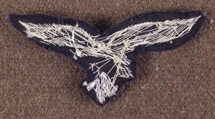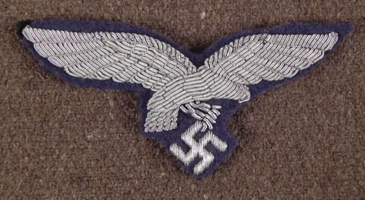 OFFERED HERE IS AN ORIGINAL NAZI LUFTWAFFE OFFICER'S TUNIC BREAST EAGLE. THIS IS A NICE VET BRING BACK WITH THE WING SPREAD BEING ALMOST 3 1/2". THERE IS SILVER BULLION THREADS ON WOOL, WITH GREAT HIGHLIGHTS. *