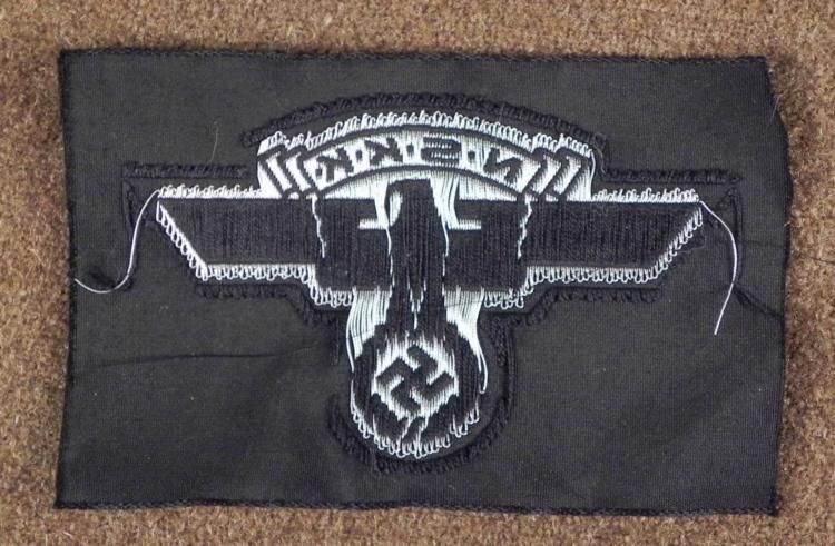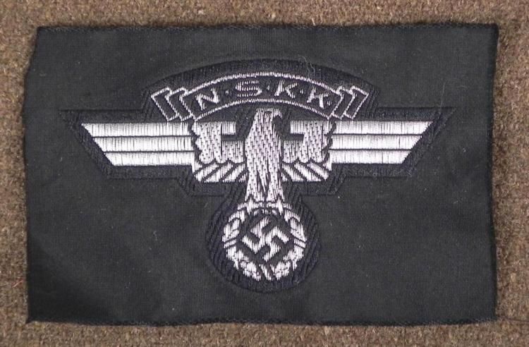 THIS AN ORIGINAL NAZI NSKK/MOTORCYCLE TROOPS UNIFORM INSIGNIA. THERE IS A NSKK IN BANNER ABOVE AN EAGLE & SWASTIKA. THE UNIFORM INSIGNIA HAS SILVER THREADS WITH A BLACK BACKGROUND. IT MEASURES OUT TO BE 3 3/4 X 2 1/4" AND IS A VET BRING BACK. * *