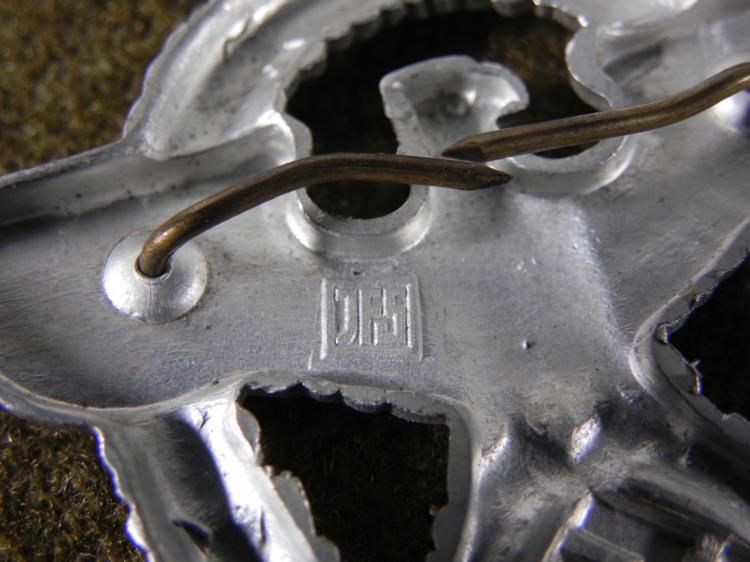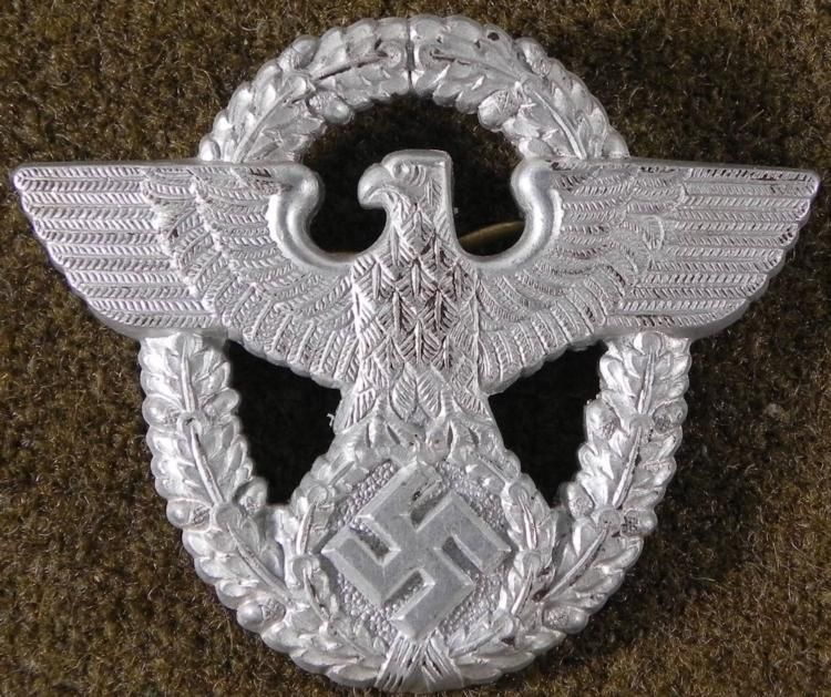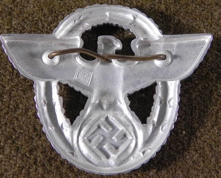 OFFERED HERE IS AN ORIGINAL NAZI POLICE VISOR WITH EAGLE, SWASTIKA & WREATH. IT HAS 2 1/4" WING SPAN WITH TWO PRONGS AND MAKER'S MARK "JFS" IN SQUARE ON THE REVERSE. * *