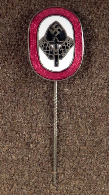 OFFERED HERE IS AN ORIGINAL NAZI RAD/REICH ARBEIT DIENST ENAMEL STICKPIN. IT IS A CORRECT TWISTED (KNURLED) PIN AND IS MARKED "RADJ, B.S.W." WITH LOGO. * * * * *