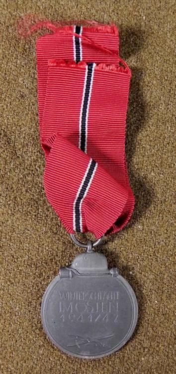 OFFERED HERE IS AN ORIGINAL NAZI RUSSIAN FRONT AWARD MEDAL WITH FULL RIBBON. * * THIS IS AN EXCELLENT NAZI MEDAL AWARDED TO THOSE WHO SURVIVED THE RUSSIAN FRONT BATTLES. ON THE FRONT IT HAS AN EAGLE & SWASTIKA, ABOVE WHICH IS A HAND GRENADE AND HELMET. ON THE REVERSE IT READS "WINTERSCHLACT IM MOSTEN 1941/42". THIS IS A NICE ORIGINAL PIECE. *