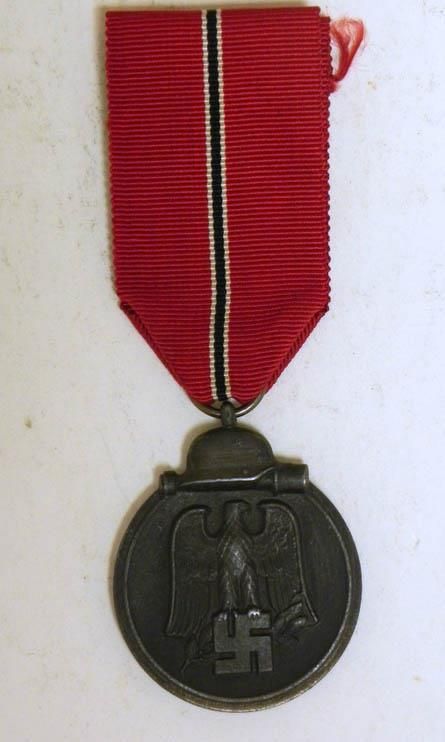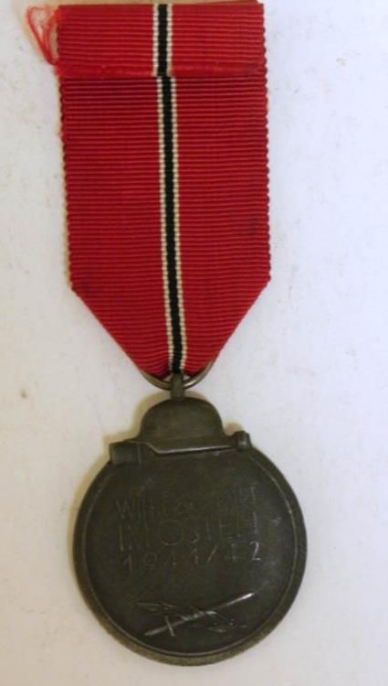 HERE IS AN ORIGINAL NAZI RUSSIAN FRONT MEDAL & RIBBON-1941/42. THE FRONT HAS HELMET AND POTATOMASHER OVER EAGLE & SWASTIKA---REVERSE READS "WINTERSCHLACHT-MOSTEN-1941/42" WITH SWORD AND LAUREL-NICE RIBBON.