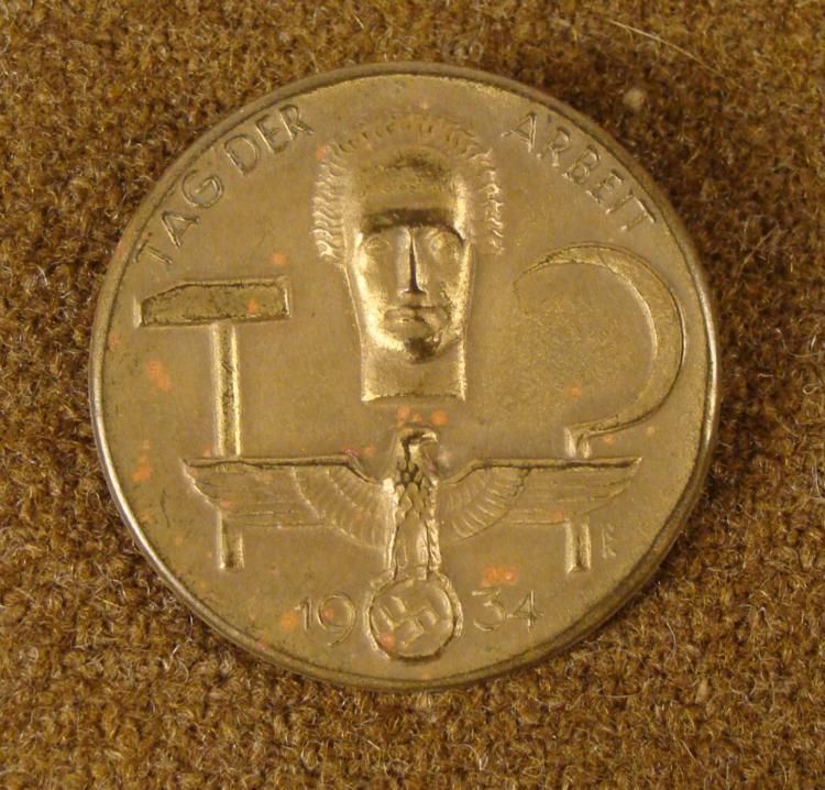 OFFERED HERE IS A NICE QUALITY ORIGINAL NAZI TAG DER ARBEIT MEDAL 1934 WITH EAGLE/SWASTIKA. IT IS 1 3/8" IN DIAMETER AND IS A PIN BACK. * * *