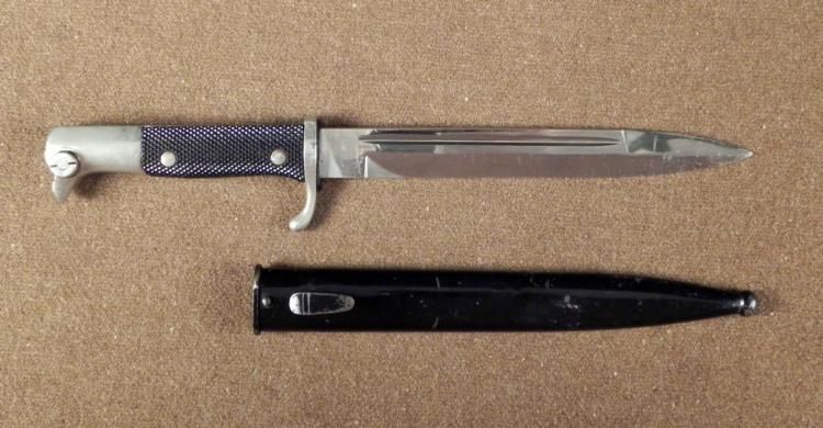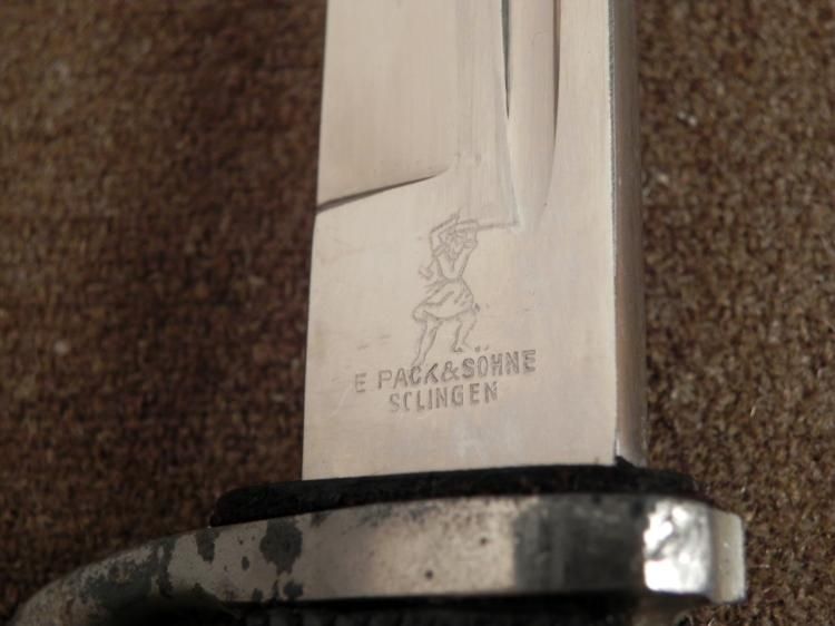 OFFERED HERE IS AN ORIGINAL NAZI WEHRMACHT DRESS BAYONET BY E. PACK & SOHN WITH EARLY LOGO. THE DRESS BAYONET HAS A NICE BRIGHT BLADE THAT IS 7 3/4" LONG. IT HAS CHEQUERED GRIP WITH SPANNER BOLTS. THE BAYONET HAS AN EAGLE HEAD POMMEL WITH RELEASE BUTTON * THAT WORKS AND RIFLE SLOT. THE SCABBARD HAS 90% OF ITS ORIGINAL BLACK PAINT. THE DRESS BAYONET IS IN VERY GOOD CONDITION. * * *