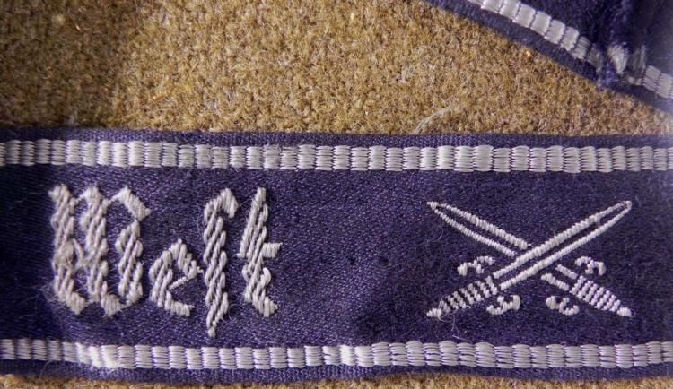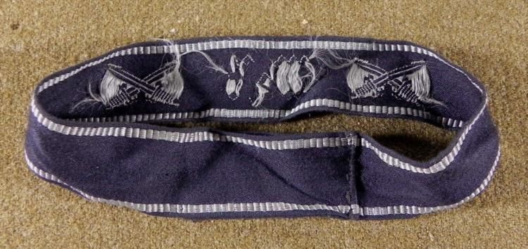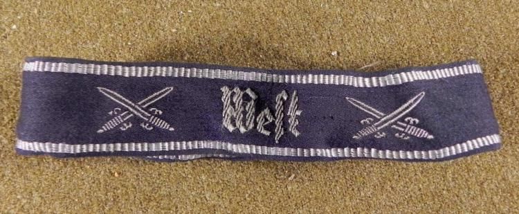 NAZI "WEST" CUFF TITLE-ORIGINAL FOR NAZI VETERANS DURING WWII-BLACK W/GRAY EMBROIDERY * SEWN & USED--"WEST" IN CENTER--SIDES HAVE CROSSED SWORDS--BORDER EMBROIDERED ON TOP & BOTTOM--NICE PERIOD ORIGINAL *
