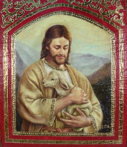 By Ortiz. Traditional Ortiz traits with crackle glaze finish and paint in high relief. Ornate gilt frame. Signed. Image 24" x 20", Overall 35 1/2" x 31 1/2"
