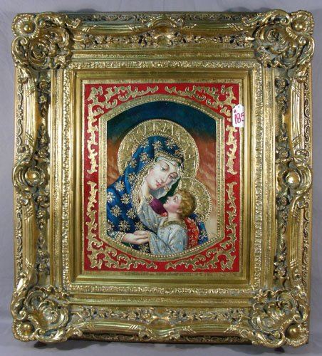 Paint in high relief. Crackled glaze finish. Ornate gilt frame. Hand signed. Overall 40 1/2" x 36".