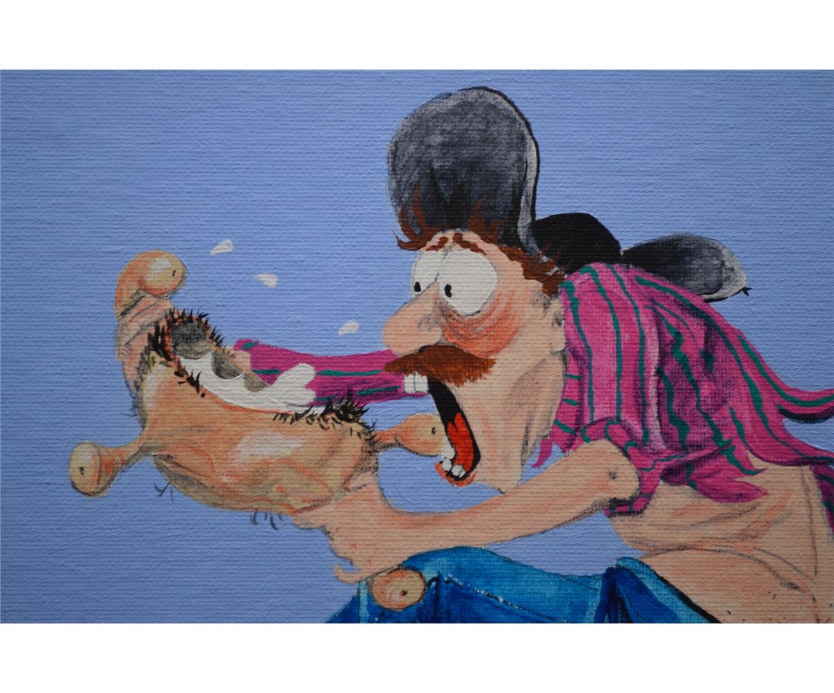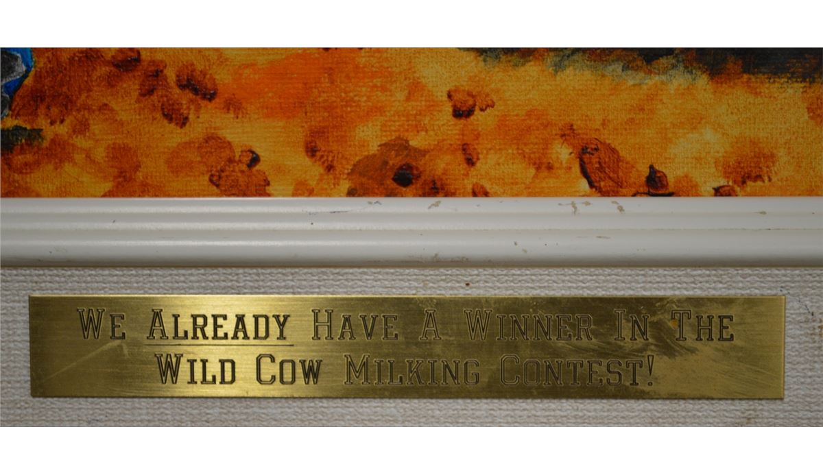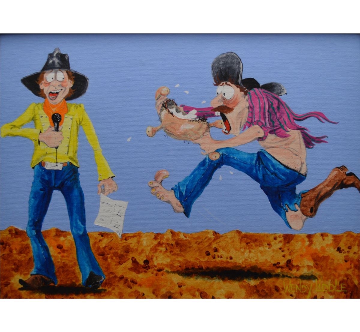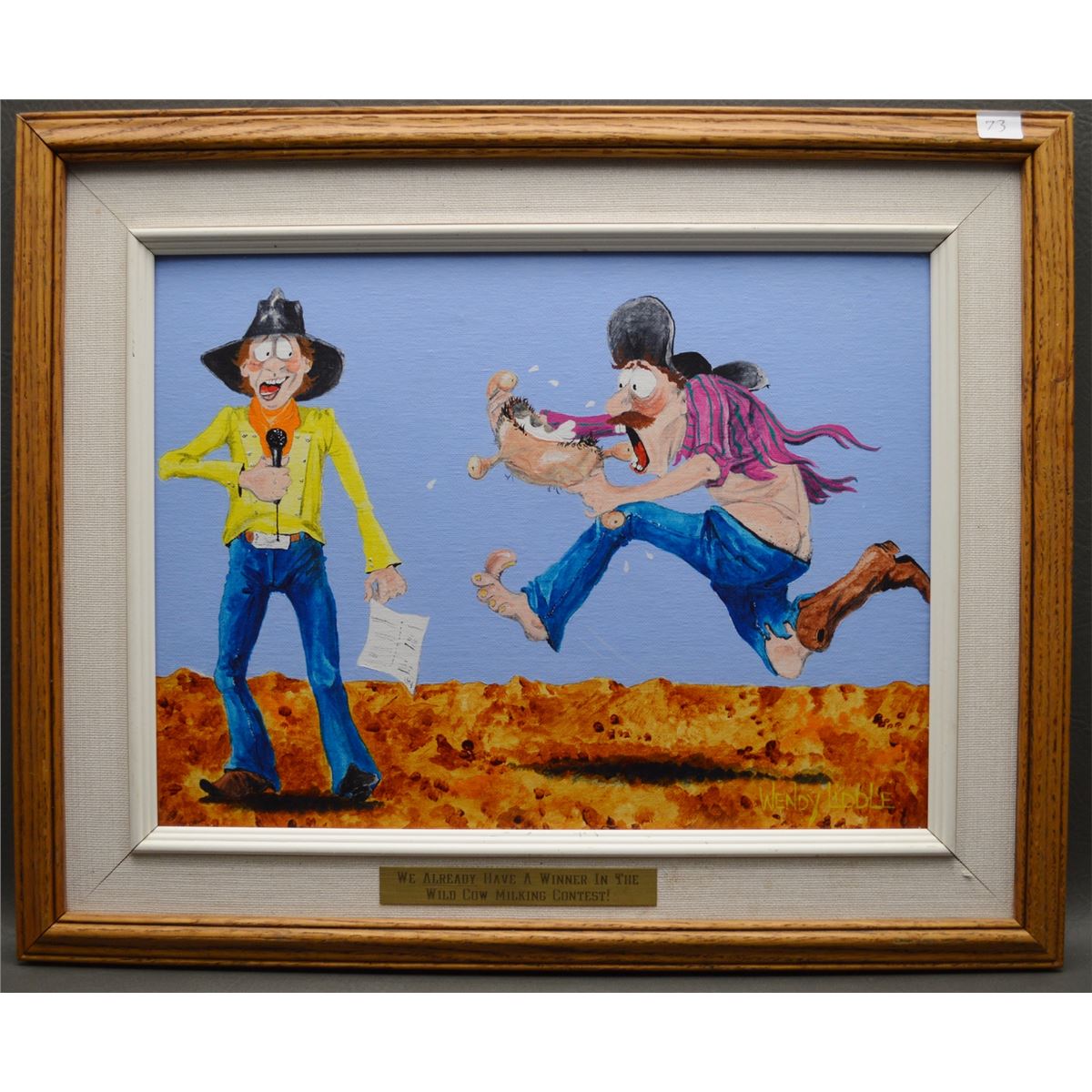 1995; Original oil on canvas titled Wild Cow Milking Contest, Signed Wendy Liddle.