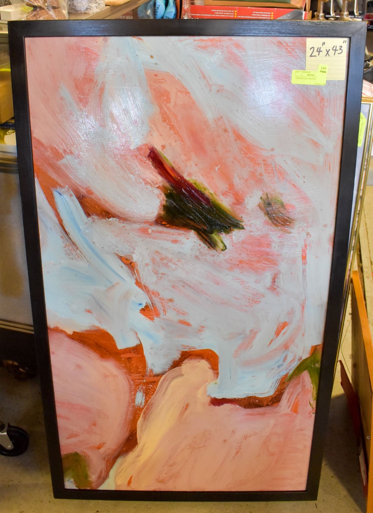 ABSTRACT OIL PAINTING ON MASONITE, FRAMED, TITLED ON BACK