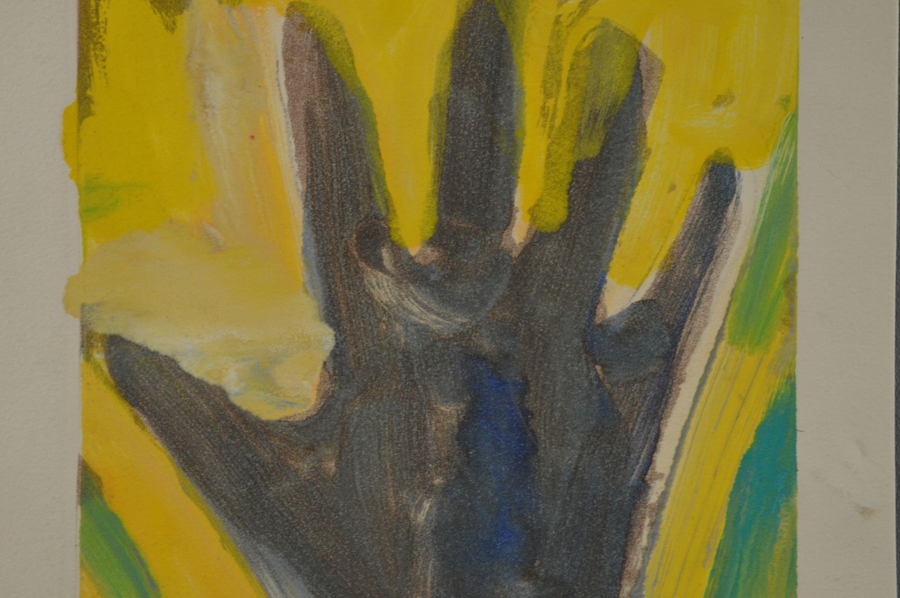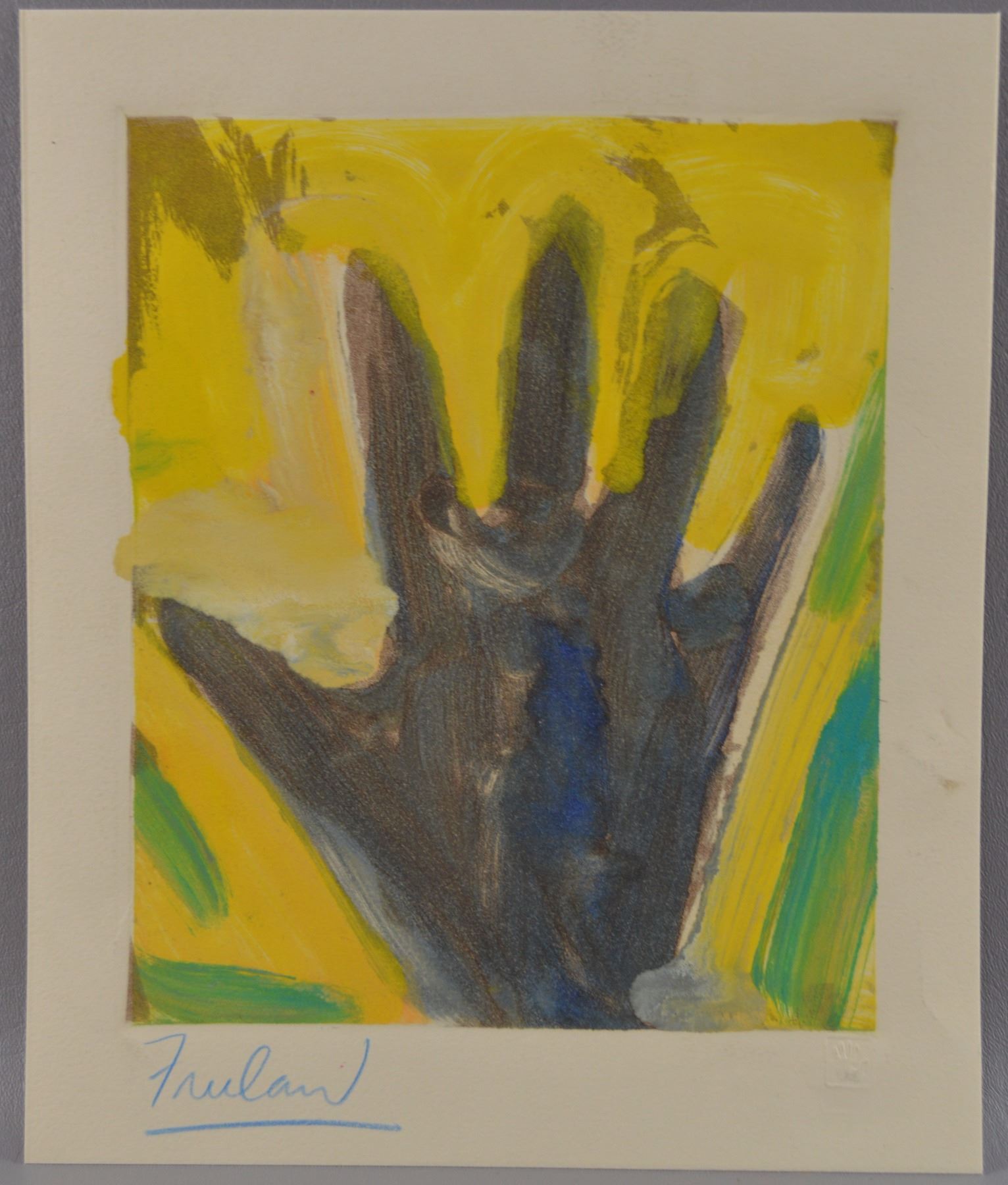 Contemporary. Hand painted on paper of hand. Signed Freeland for Aaron Freeland. Image 7.75" x 9.25",full paper 15" x 22"