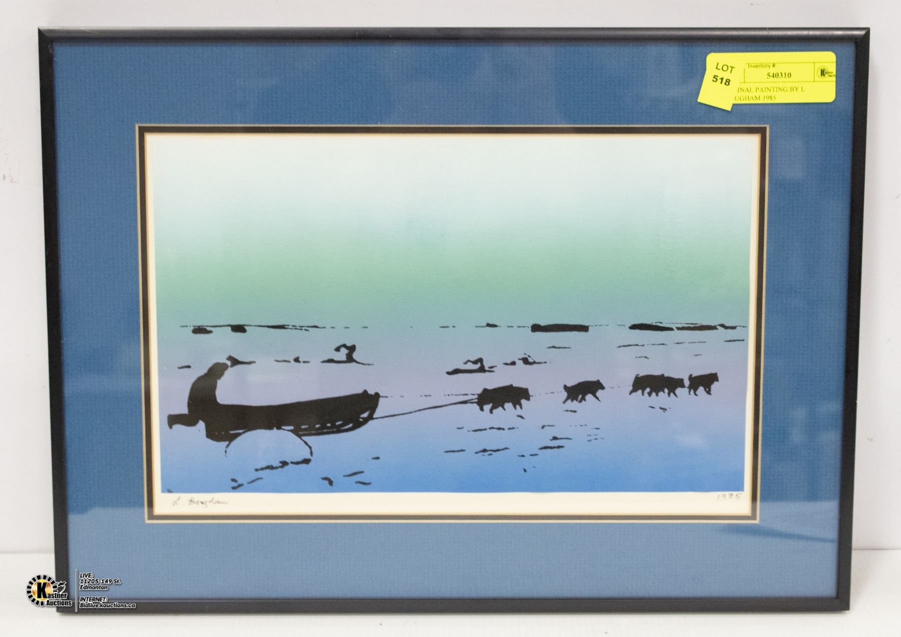 WATER PAINTING OF NOTHERN SCENERY WITH DOG SLED TEAM SIGNED BY L. BROUGHAM 1985