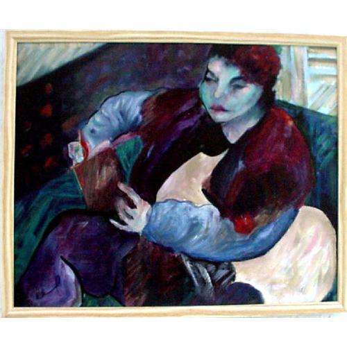 Original painting in acrylics on canvas by Brenda Ginsberg. Measurements: canvas: height 15 1/2"' width 19". Frame is 1/2" wide. Painting depicts a woman sitting in a large armchair reading a book. A shawl over her shoulders matches the throw over the back of the chair. Trellised window behind her. Very restful and cosy. Light coloured wooden frame. Signed and in good condition.