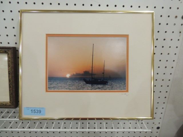 BEAUTIFUL PHOTOGRAPH OF A SAILBOAT ON THE LAKE AT SUNSET. COULD BE LAKE MICHIGAN. SIGNED BY THE PHOTOGRAPHER. MEASURES 16'" X 13" FRAMED AND MATTED AS SHOWN.