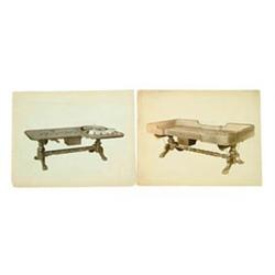 ORIGINAL PHOTOS FROM GAMBLING EQUIPMENT COMPANY CATALOG. These were cut from an album which had canvas backing sheets with typed descriptions of the items. The details of the photos are outstanding. Shown are six roulette tables, one Black Jack table and one unidentified table. There is also a plain table with various tops and parts, including chips, in carrying cases. Looks like the roulette table shown on previous photo disassembled for shipping. CONDITION: Excellent pictures with sharp details. 4-53339 FS503