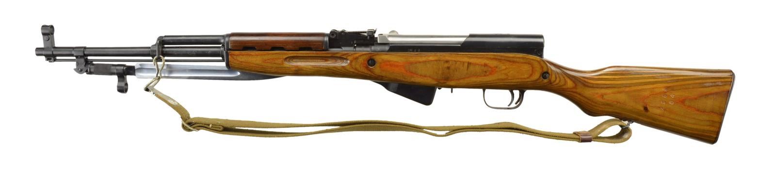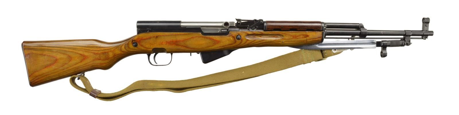 Cal. 7.62x39. S# OM64. Bbl. 20.5”. The SKS rifles & carbines, once overlooked while their newer big brother, the AK47, received all of the attention, has finally found its place w/ shooters & collectors, becoming quite valuable & highly sought after. The most desirable are the original Russian variants such as this CAI import. Beautiful laminated hardwood stock w/ attractive under folding blade style bayonet. Hooded post front sight & rear tangent sight adj. to 1000m. Most visible parts bearing a number have the original Russian markings & are matching, including; magazine, trigger group, receiver, & bolt carrier. The stock has had the original number struck through with “64” added to match. Top cover marked w/ 5 pointed star & north pointing arrow armorer’s mark & “1952r” indicating Tula manufacture. Finish on exposed metal surfaces is matte black & matching. Tan canvas sling. On board cleaning kit in the stock. MAGS: 10-rd. integral. CONDITION: Finish on exposed metal surfaces bears a very sm. amount of minor scratching, typically associated w/ mechanical engagement wear & possibly vertical storage wear and a small rub mark on top cover. Bayonet locks tightly in both positions. Bore is clean w/ strong rifling. Fire control mechanism appears to function correctly when cycled by hand. (22-2466/JZ). CURIO. $300-500.