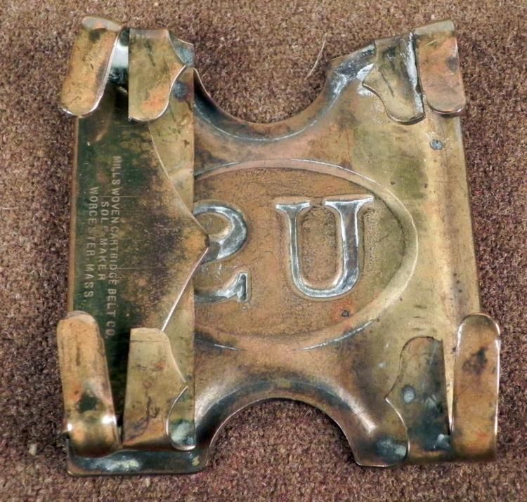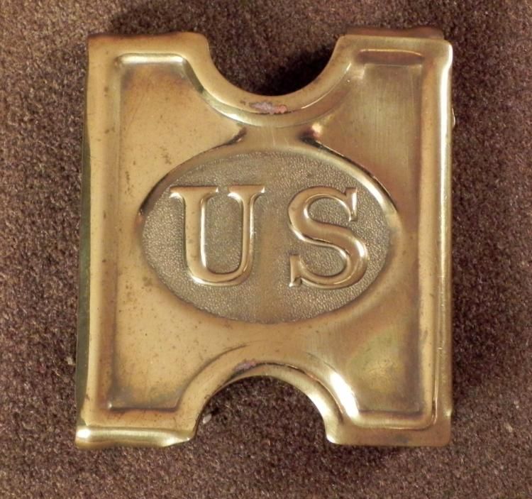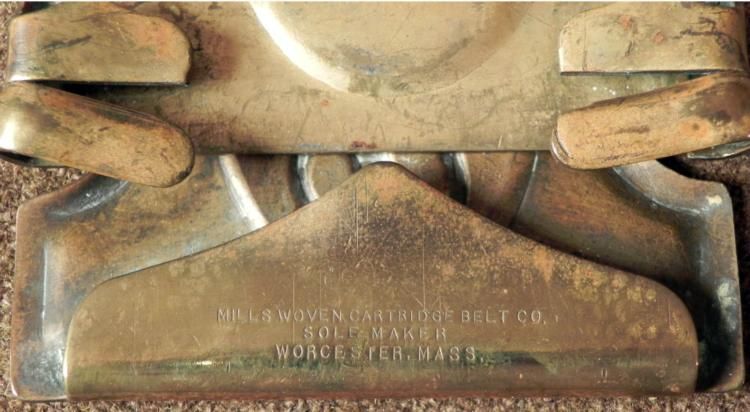 HERE IS AN OUTSTANDING ORIGINAL BRASS, SPANISH-AMERICAN WAR "US" CARTRIDGE BELT BUCKLE. IT IS IN THE SHAPE OF THE LETTER "H" WITH "US" IN CENTER. THE BELT BUCKLE HAS BEEN POLISHED IN FRONT, BUT THE NOT BACK. ON THE REVERSE IT IS MARKED "MILLS WOVEN CARTRIDGE * BELT COMPANY-SOLE MAKER-WORCHESTER, MASS". *
